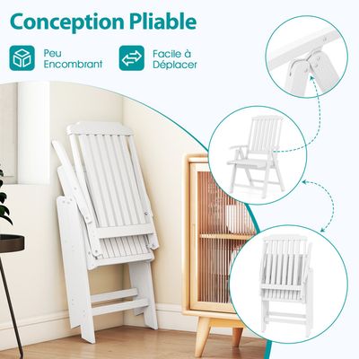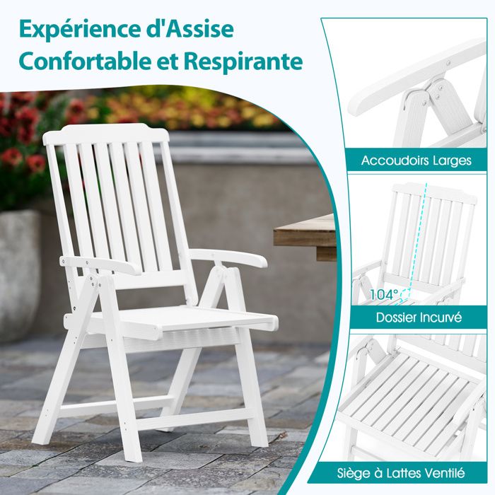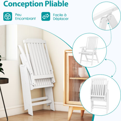 Sa texture ressemblant au bois ajoute également une touche d'élégance à votre espace de vie. Chaise Terrasse Dossier Courbé COSTWAY Banc De Jardin Exterieur En HDPE, Banc Extérieur Jardin 2 Places Avec Dossier Et Accoudoirs Charge 320 Kg Pour Parc Cour Plage 132x65x91cm Noir132 X 65 X 91 Cm 86869238 Chaise HDPE Pliable 150kg Blanc Design Lattes Extérieur Notre chaise de patio pliable mesure 55 x 63 x 101 cm (L x l x H), ce qui en fait une solution d'assise polyvalente et élégante pour divers environnements intérieurs et extérieurs. Chaise De Salle à Manger, Lot De 2, Pu, Pieds En Acier Réglables... Ses dimensions sont de 63 x 55 x 101 cm (L x l x H) et la chaise pliée mesure 55 x 96 cm (L x H). 【Durabilité pour Tous Temps】Fabriquée à partir de matériau HDPE de qualité supérieure et équipée de vis en acier inoxydable, cette fauteuil résiste à toutes les conditions météorologiques. Design Pliable Facile : Cette chaise de patio peut être facilement repliée en une taille plate pour un transport facile et un rangement peu encombrant... Caractéristiques : Facile à plier en une taille compacte, facile à déplacer, économise de l'espace Fabriquée en HDPE résistant aux intempéries, imperméable Équipée de vis en acier inoxydable, antirouille, conçue pour durer Le dossier courbé, siège large et accoudoirs épousent la forme de votre corps Le design à lattes empêche efficacement l'accumulation d'eau Avec sa texture de type bois, ajoute une touche de sophistication et de style Ajout idéal pour les environnements intérieurs et extérieurs Spécifications : Couleur : Marron/Noir/Blanc Matériau : HDPE, Acier Inoxydable Dimensions du Produit : 55 x 63 x 101 cm (L x l x H) Taille de Pliage : 55 x 96 cm (L x H) Taille du Siège : 48 x 49 cm (L x l) Hauteur du Siège : 43 cm Hauteur de l'Accoudoir : 62 cm Capacité de Charge : 150 kg Poids Net : 11 kg Contenu de l'emballage : 1 x Chaise Pliante 1 x Manuel de l'Utilisateur Lorsqu'elle n'est pas utilisée, vous pouvez facilement la plier en une taille plate, qui ne prend pas beaucoup de place au sol, idéale pour les petits espaces ou une utilisation temporaire. 【Entretien Faible】La chaise de salle à manger en HDPE doté d'un design à lattes qui empêche l'accumulation d'eau et est facile à nettoyer avec un chiffon. Lot de 4 Chaises de Jardin en Fer et en Textilène Pliantes De plus, elle est conçue avec des accoudoirs larges, un dossier courbé ergonomiquement, et un siège à lattes ventilé, offrant une posture d'assise détendue, améliorant votre relaxation, que vous profitiez d'un calme café du matin ou de rencontres sociales animées en extérieur. 【Utilisation Polyvalente】La chaise est parfaitement adaptée à diverses occasions intérieures et extérieures, des barbecues dans le jardin et moments de détente sur le balcon à d'autres événements intérieurs ou même dans les cafés et parcs.