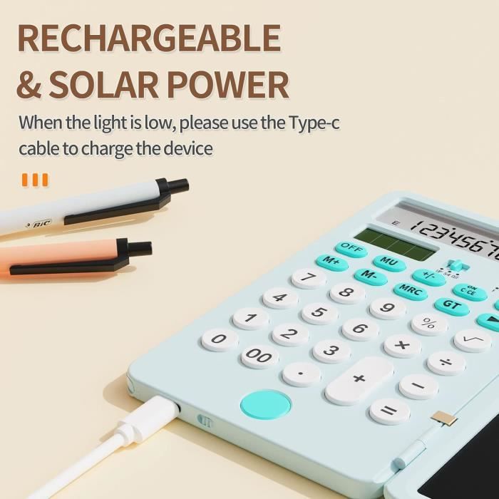 Calculatrice Amazon Calculatrice De Bureau Calculatrice Avec Bloc-Notes 12 Chiffres Grand Affichage Support Solaire Bloc-notes Effaçable LCD Stylet Inclus Calculatrice avec bloc-notes, écran LCD 12 chiffres, solaire Écran LCD Crystal Clear] avec un grand écran LCD à 12 chiffres Ce calculatrice garantit que chaque numéro est affiché avec une clarté exceptionnelle. L'affichage à contraste élevé fournit une lecture facile des résultats de calcul, même dans des conditions de faible luminosité, ce qui le rend idéal pour une utilisation prolongée... Alimentation : énergie solaire + pile CR2032 (incluse). Parfait pour : Employés de bureau – Suivez les dépenses, prenez des notes Étudiants – devoirs de mathématiques, préparation aux examens Shopping – Budgétisation, vérification des prix Réunions d'affaires – Calculs rapides + mémos Contenu : 1 calculatrice avec bloc-notes, blanc., 1 stylet., 1 pile CR2032., Manuel d'utilisation (français non Garantie et assistance : ✔ Garantie 1 an Bloc-notes intégré + stylet - Écrivez, calculez et effacez à l'infini - pas besoin de papier Parfait pour les mémos rapides, les budgets ou les mathématiques. Caractéristiques : ✔ Affichage : LCD à 12 chiffres (105 x 23 mm). Touches à réponse rapide – Boutons en plastique ABS avec espacement parfait – empêche les fautes de frappe lors des calculs rapides. Double alimentation (solaire + batterie) - Panneau solaire (pour calculatrice) + pile CR2032 (incluse) pour la sauvegarde. Design de bureau stable : pieds en caoutchouc antidérapants pour le maintenir stable sur les bureaux. Vous pouvez prendre des notes tout en calculant sans papier, ce qui améliore l'apprentissage et l'efficacité du travail, vous permet d...