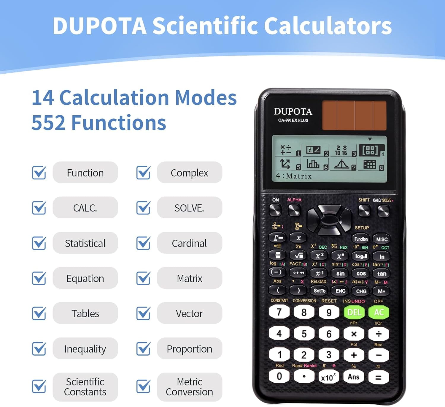 Avec la garantie, vous bénéficiez des avantages suivants : Service d'échange express Calculette Casio College Fx-92 Casio Fx-87DE X ClassWiz Avec Extension de garantie à 5 ans : Profitez de l’extension de garantie exclusive CALCUSO pour le Casio fx-991DE X. Calculatrice Casio College Calcuso Pack économique : Calculatrice Scientifique Technique Casio FX-991 DE X étui De Protection WYNGS Turquoise Calculatrice Scientifique Casio Fx-991DE X Fermeture éclair à trois côtés pour un rangement sécurisé Prolongation de la garantie du fabricant Casio FX-991DE X · Avec 696 fonctions, le modèle le plus puissant de la calculatrice technico-scientifique · La fonction QR Code du Casio FX-991DE X permet de... Parfait pour l’école et le travail ! La Casio fx-991DE X est une calculatrice de poche puissante offrant 552 fonctions, notamment pour les mathématiques, la trigonométrie et les statistiques. Le sac de protection se ferme avec une fermeture éclair sur trois côtés. Le choix de couleurs de WYNGS Achetez vos sacs de protection dans leur couleur... Expédition gratuite de l'appareil défectueux et du nouvel appareil Protection et sécurité pendant 5 ans Elle protège efficacement contre les éclaboussures, les chocs et les rayures – idéale pour les déplacements, l’école ou les études, et elle prolonge la durée de vie de votre calculatrice ! Caractéristiques : 696 fonctions, Solaire + Batterie, Arrêt automatique Étui de protection WYNGS Boîtier rigide robuste pour une protection idéale, Ajustement précis Avec 5 ans de couverture, vous êtes parfaitement protégé – pour une fiabilité durable à l’école, à l’université et au travail !