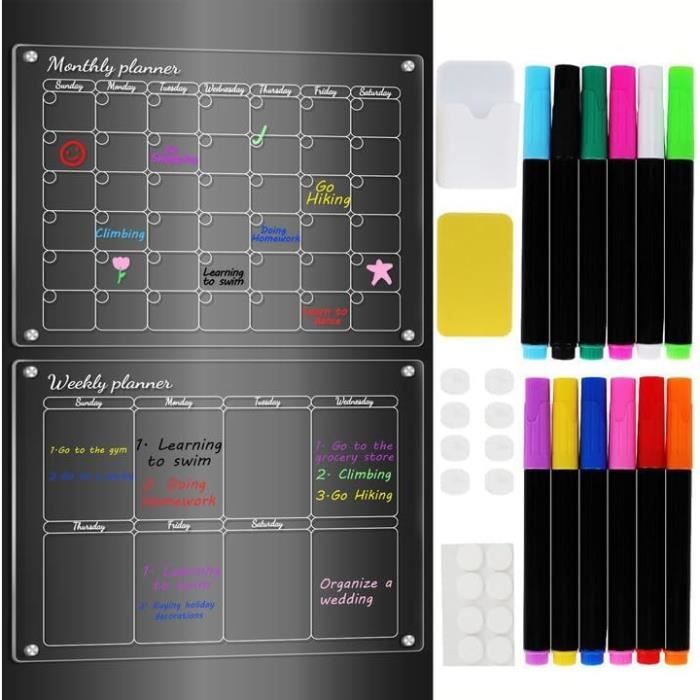 Adapté aux familles, aux étudiants, aux amateurs de fitness et aux équipes professionnelles, il offre des applications flexibles dans de nombreux contextes. Son écriture fluide, son encre à séchage rapide et ses gommes intégrées facilitent la mise à jour de vos plans à tout moment, sans laisser de traces ni de traces. 【Restez Organisé Chaque Semaine】: Planifiez vos repas, suivez vos tâches, gérez vos devoirs ou créez des plannings hebdomadaires du lundi au dimanche. Vous pouvez organiser votre travail par membre de la famille, type de tâche ou niveau de priorité, pour une planification plus intuitive et efficace., 4., Tableau polyvalent et multi-usages Il peut non seulement servir de tableau de menus hebdomadaire, mais aussi de planificateur d'études, de suivi de remise en forme, de tableau de tâches ménagères, et bien plus encore. Tableau Frigo Magnétique Calendrier Magnétique Frigo Transparent 【Écriture et Effacement Faciles】: Ce planificateur magnétique pour réfrigérateur est livré avec 6 marqueurs magnétiques effaçables à sec colorés qui se fixent directement sur votre réfrigérateur. Simple et élégant, il permet d'enregistrer clairement les informations sans perturber le style de votre maison., 2., Force magnétique ultra-puissante et protection anti-rayures Les aimants N52 intégrés aux quatre coins adhèrent solidement aux surfaces métalliques, empêchant tout glissement ou écaillage. 2 Pièces Calendrier agnetique Frigo Transparent Acrylique Planning... Comprend un tableau de planification en acrylique de 30,5 x 20,3 cm et 6 marqueurs magnétiques, idéal pour les étudiants, les familles, les collègues et tous ceux qui aiment s'organiser. Caractéristiques : 1., Son design élégant et transparent ne gâche pas l'esthétique du réfrigérateur. 【Acrylique de Qualité Supérieure et Aimants Puissants】: Fabriqué en acrylique transparent et doté de 4 puissants aimants d'angle N52, ce calendrier magnétique pour réfrigérateur adhère fermement à toute surface métallique sans perçage ni colle. Ardoise Effacable Calendrier Acrylique Magnetique Frigo, Planificateur Hebdomadaire De Calendrier Frigo Comprend six marqueurs magnétiques pour tableau blanc de différentes couleurs qui se fixent directement sur le réfrigérateur pour un accès et une écriture faciles Ce calendrier effaçable à sec vous aide à garder votre maison, votre bureau ou votre vie personnelle bien rangés, organisés et sans stress.