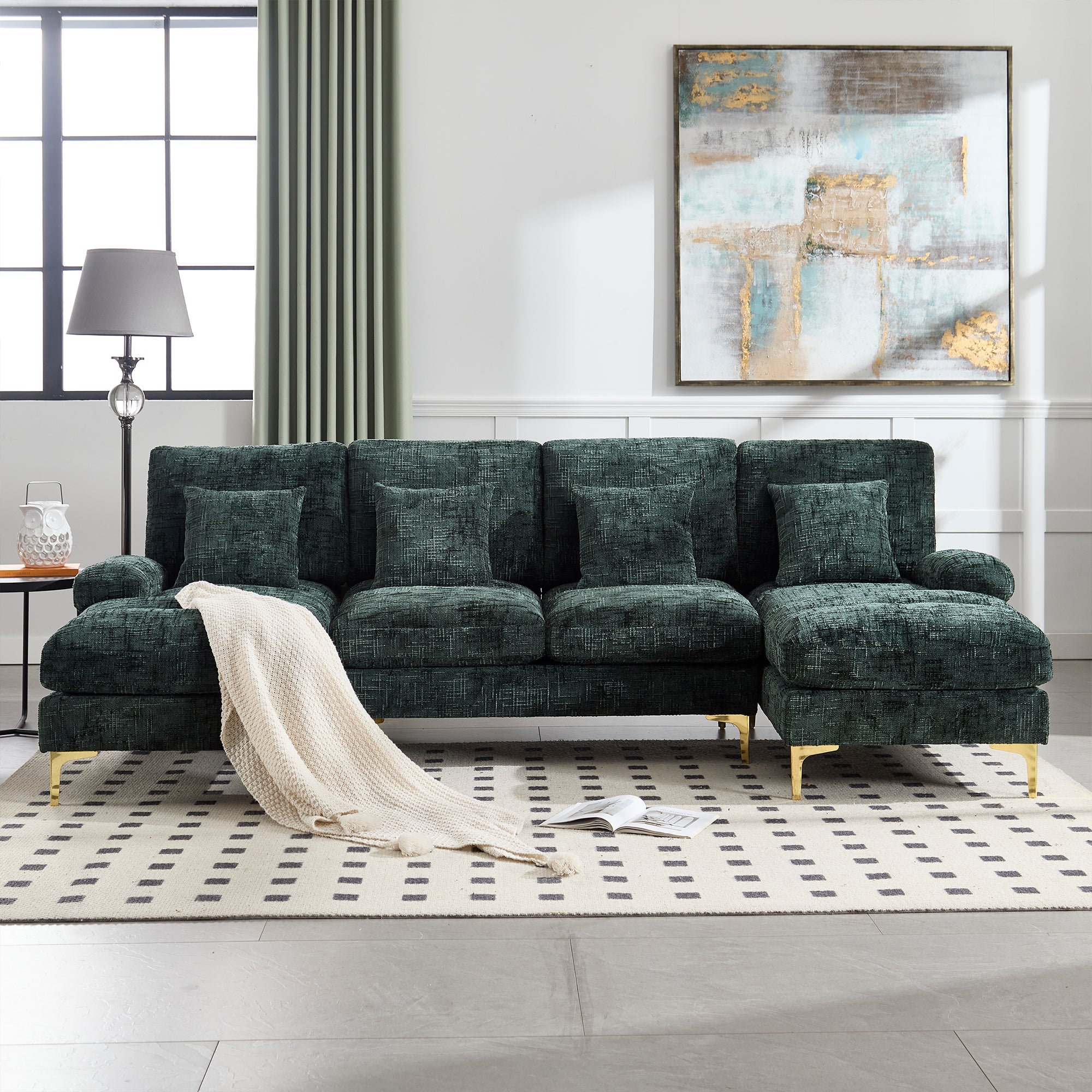 Il est équipé de deux fauteuils inclinables et de coussins d'appui pour répondre à divers besoins en matière de position assise et de détente. Canapé Modulable En U 4 Places Seyakany Canapé Modulaire Moderne, Canapé En U Avec Deux Fauteuils Canapé 4 Places Avec Fauteuils Inclinables Les lignes fines et fluides associées à des couleurs élégantes permettent au canapé de s'intégrer naturellement à différents styles de décoration,tels que le style nordique,le style moderne et minimaliste ou le style luxueux. De plus,il est recouvert d'un tissu chenille de qualité,doux et agréable au toucher. Design moderne : les pieds métalliques dorés de 15 cm de haut ajoutent une touche de luxe et d'esthétique moderne à l'ensemble, rehaussant ainsi facilement le style général. De plus, la conception surélevée des pieds offre suffisamment d'espace pour les robots aspirateurs, rendant le nettoyage quotidien plus pratique et plus efficace. Canapé fixe Patrizia, Canapé modulable 2 places avec péninsule droite De plus,ce canapé est recouvert d'un tissu chenille de haute qualité, doux et agréable au toucher. Conception spacieuse en U : la disposition en U fait de ce canapé un lieu idéal pour les interactions familiales, parfait pour les soirées cinéma, les réunions entre amis ou les moments en famille. Détails du produit : Dimensions totales du produit : 272 x 136 x 88 cm Dimensions détaillées du produit : veuillez vous référer à l'image des dimensions Type de produit : canapé Matériau principal : chenille Matériau de rembourrage des coussins : mousse plastique Matériau de rembourrage du dossier : mousse plastique et rembourrage moelleux Matériau du cadre : contreplaqué Nombre de places assises : 4 Quantité par emballage : 3 Poids net : 71., 1 kg Remarque : 1., Toutes les dimensions sont approximatives., 2., En raison des mesures manuelles,il peut y avoir une erreur de 2 à 3 cm., 3., En raison de la lumière, il peut y avoir une différence de couleur entre la photo du produit et l'objet réel, veuillez vous référer à l'objet réel reçu., 4., Si les clients rencontrent des problèmes pendant le processus d'installation,veuillez nous contacter dès que possible. Le choix de matériaux de qualité améliore non seulement le confort, mais offre également une expérience d'utilisation sûre et fiable. Ce produit sera expédié en 3 colis qui peuvent ne pas arriver en même temps. La conception inclinable des deux côtés offre plus de confort et répond aux besoins de différents utilisateurs.Le design du canapé allie fonctionnalité et esthétique, ce qui en fait un choix idéal pour le salon,la chambre à coucher,le bureau et l'appartement Canapé U-Shape moderne en chenille avec pieds métalliques dorés, design... Ce canapé modulable est conçu en forme de U, ce qui le rend idéal pour les soirées cinéma, les réunions entre amis ou les moments en famille. À la fois esthétique et pratique, ce canapé est idéal pour le salon, la chambre à coucher, le bureau et l'appartement. Matériaux de qualité : ce canapé modulable moderne est doté d'une structure en bois massif de qualité,solide et résistante, qui ne se déforme pas à l'usage. Ce canapé-lit allie fonctionnalité,style et praticité,ce qui en fait un meuble à la fois élégant et utile.