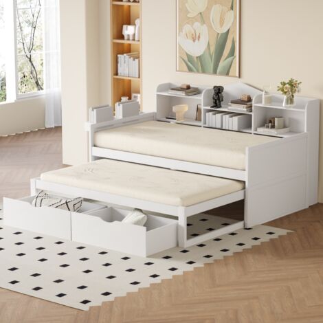 Lit Transformable Salon Chambre Canapé-lit 90/180x190 Cm Lit Double Avec Lit Gigogne, Dossier, Accoudoirs Incurvés, Tiroirs Et Sommier A Lattes En Bois Massif Gris 86494336 Lit Design Blanc Lit gigogne avec rangement et bureau 90x200 TIMO en chêne Canapé-lit en bois massif 90x190 cm - avec lit gigogne - avec... Des prises électriques multifonctionnelles permettent de recharger rapidement les appareils grâce à une multitude de connecteurs. Type de produit : lit multifonctionnel Dimensions : 90/180 * 190 cm Couleur : blanc/gris Matériau du produit : bois de pin + contreplaqué + MDF Niveau d'assemblage : assemblage complet requis/assemblage partiel Poids total du colis : 73,48 kg Nombre de lattes : 27 Temps d'assemblage estimé : 2 heures Nombre de personnes recommandé : 2-3 Outils supplémentaires requis : tous les outils sont inclus/tournevis Évitez les outils électriques : oui Design polyvalent et moderne - Doté d'un espace de rangement pratique et de prises multifonctionnelles, ce canapé-lit polyvalent est parfait pour les salons et les chambres à coucher modernes. Des étagères et des compartiments de rangement dans la tête de lit, plusieurs compartiments de rangement sur le côté du lit et des tiroirs sous le lit gigogne offrent suffisamment d'espace pour ranger les objets du quotidien, les livres et les articles de décoration. Beaucoup d'espace de rangement - Des étagères et des compartiments de rangement dans la tête de lit, plusieurs compartiments de rangement sur le côté du lit et 2 tiroirs sous le lit gigogne offrent un espace de rangement suffisant pour les objets du quotidien, les livres et les articles de décoration. Couchage extra large - Ce lit gigogne simple multifonctionnel en bois massif peut être transformé en un couchage extra large de 180*190, facile à pousser et à tirer ; il permet d'optimiser l'espace dans les petites pièces, ce qui en fait un choix idéal pour les clients. Son aspect simple et aérien, associé à son design pratique et moderne, s'adapte à une grande variété de styles d'intérieur. Ce lit gigogne simple multifonctionnel en bois massif peut être transformé en un lit de 180 x 190 cm, facile à pousser et à tirer ; il permet d'optimiser l'espace dans une petite chambre, ce qui en fait le choix idéal pour les clients