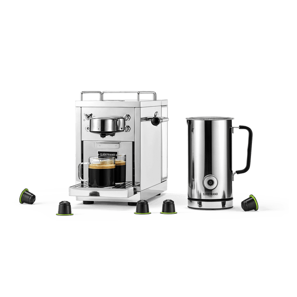 Sjöstrand - L'Original Machine à Café Capsules Inox Beige Sable Mat - Les Secrets du Chef Mousseur à lait Mousseur Lait Intégré Design Scandinave Machine à Capsules Compatible Nespresso® The Original Black De Sjostrand Pour Cappuccino Latte Boîtier inox beige mat ultra élégant qui s'intègre partout. Compatible capsules durables (pas d'aluminium ni plastique). Fonctions smart : dosage... Machine à capsules compatibles Nespresso® Beige - Sjöstrand · Coloris : Beige · Matériaux : acier inoydable · Compatible capsules Nespresso® · Le...