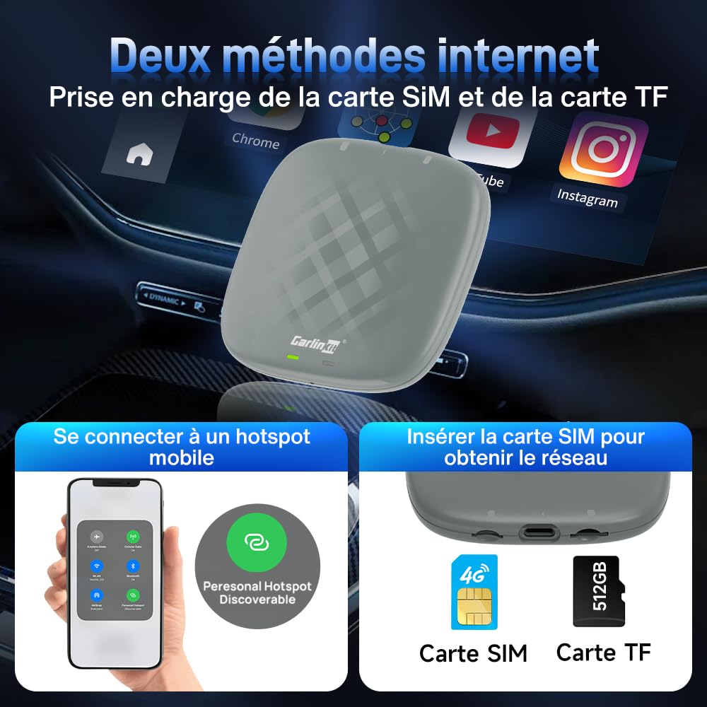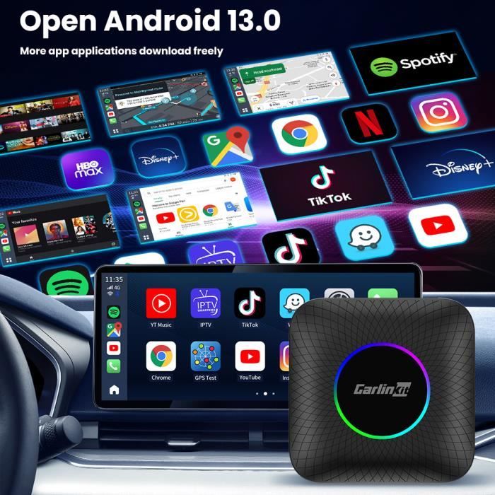 Il prend également en charge la visualisation de vidéos en ligne et la navigation GPS. Après la configuration initiale, le dongle USB démarre automatiquement lorsque le moteur de la voiture démarre, et se connecte rapidement à votre iPhone et téléphone Android sans sortir le téléphone de votre poche. Mise à jour du micrologiciel pris en charge. Vous pouvez télécharger l'application Google sur le système Android 13., 0 et accéder au réseau via une connexion WiFi ou une carte SIM. Carlinkit Android 13.0 CarPlay Ai Box Max (Refurbished CarPlay sans fil et fonction automatique Android sans fil : cet appareil est une technologie passionnante pour tous ceux qui veulent créer des systèmes CarPlay et Android Auto sans fil. Fonctions principales : équipé du système Android 13., 0, prend en charge 4 Go (RAM) + 64 Go (ROM). CarlinKit Android 11 carplay AI Box(4 64GB),Support Android Auto sans... De plus, si vous n'êtes pas sûr de la compatibilité avec votre voiture, veuillez nous indiquer le modèle et l'année de votre marque, nous vous répondrons dans les 24 heures. (Attention : ce produit n'est pas compatible avec les modèles BMW System Series). (Veuillez désactiver le Bluetooth de votre voiture avant utilisation). CarPlay Sans Fil Android Auto CarlinKit Android 13.0 AIBox Plus-LED Adapter, Pour Voiture Avec CarPlay Filaire Et Android Auto, 8-Core QCM6115, RAM 4GB+ROM 64GB, GPS Intégré, Carte SIM & TF, CarPlay Sans Fil Et Android Auto Carlinkit Ai Carplay Il vous suffit de connecter l'appareil au port USB CarPlay/Android Auto de votre voiture et de suivre les instructions pour compléter la configuration. En quelques minutes, le CarlinKit Aibox vous permet de découvrir une nouvelle expérience de conduite Nous fournissons une assurance qualité : nous inspecterons strictement avant l'expédition et accordons une garantie d'un an.