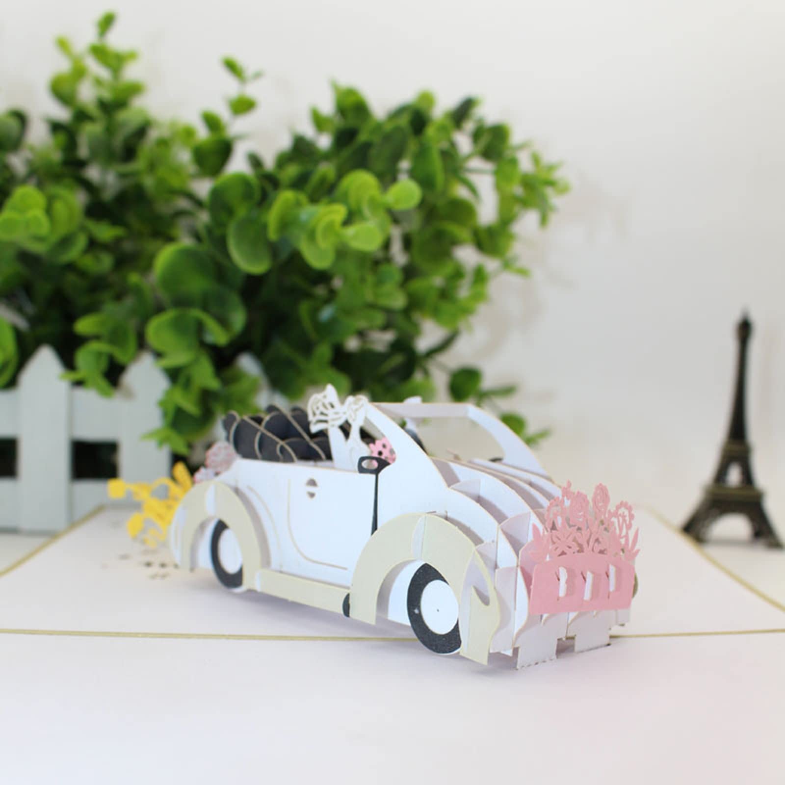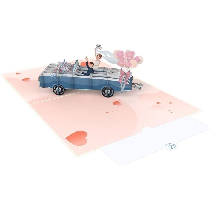 Carte de mariage pop-up avec couple de mariés, carte de mariage 3D... Carte 3D pour mariage La couverture dorée de cette carte pop-up de mariage illustre la quintessence du bonheur pour toujours : un couple de jeunes mariés qui part au coucher du soleil. Pop up convertible blanc avec des arrangements floraux roses pour révéler une mariée et un marié heureux alors qu'ils conduisent dans leur nouvelle vie Just Married Voiture Carte Pop Up De Mariage, Carte De Voiture De Mariage 3D « Just Married Carte Mariage Pop Up Voiture De Mariage Aquarelle Vient De Se Marier Isolé Sur Fond Blanc