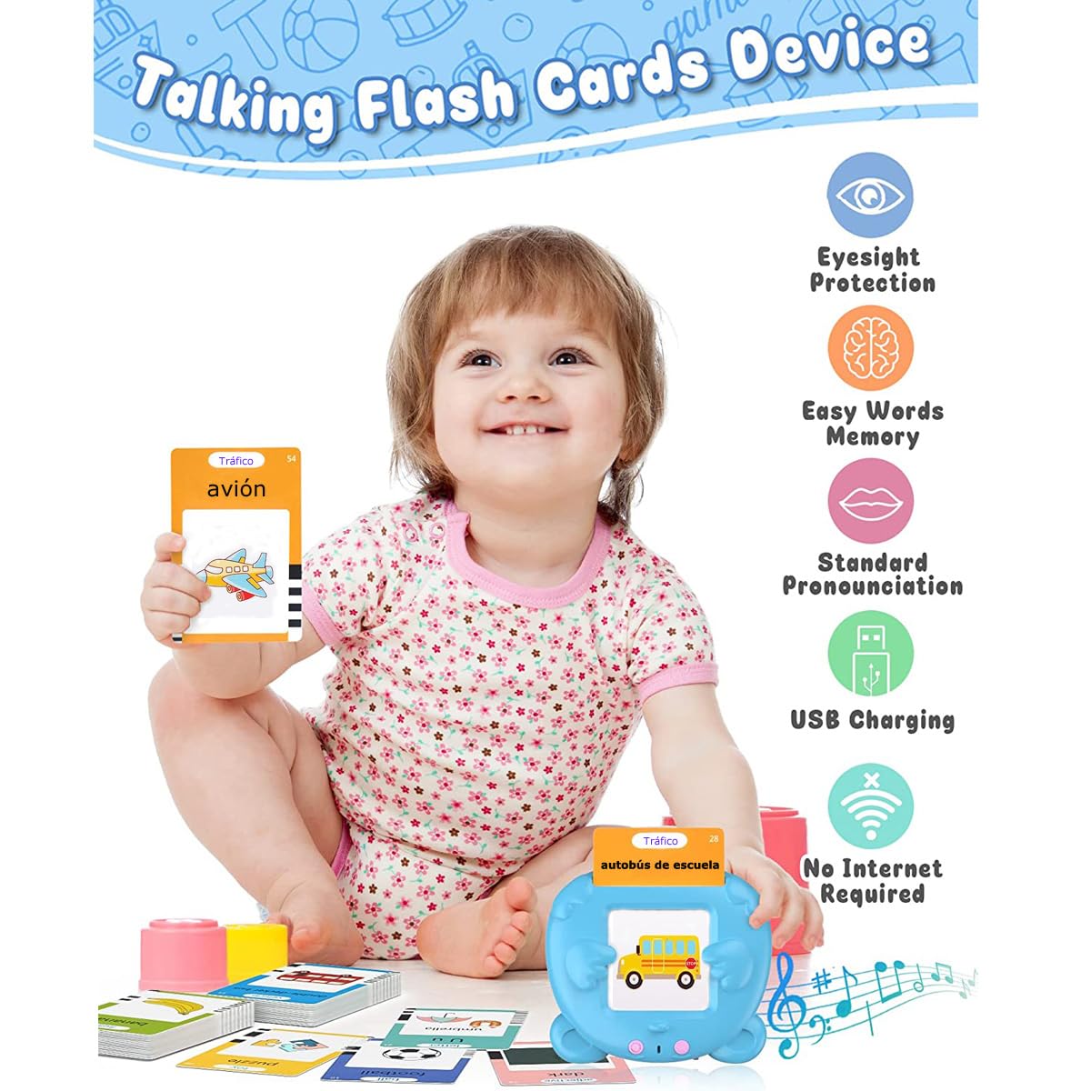 Description du produit 2025 Nouveaux Jouets D'apprentissage Pour Tout-petits Cartes Flash Parlantes Les jouets éducatifs d'apprentissage pour tout-petits âgés de 3+ ans sont des jouets de ressources d'apprentissage préscolaires idéaux pour la maison et la salle de classe. Il inclut également des chansons populaires pour enfants. Facile à utiliser Allumez l'appareil et insérez la carte flash, et le lecteur prononcera. Les cartes flash parlantes couvrent 31 sujets, y compris 56*animaux, 31*produits, 30*emplacements, 30*adjectifs, 26*lettres, 25*véhicules, 24*jouets, 24*types de corps, 21*aliments, 20*comportements, 18*types de météo, 18*sortes de fruits, 17*légumes, 16*types de maisons, 16*types de vêtements, 13*numéros, 12*mois, 12*instruments, 10*postes, 10*naturels, 10*sortes de balles, 9*couleurs, 8*métiers, 8*incontournables, 8*types de familles, 8*animations, 8*actions, 7*types de jours de la semaine, 6*émotions, 5*formes, 4*saisons. 【Facile à Utiliser】Les cartes flash parlante existe 3 modes différents - Mode Bilingue(anglais et français), Mode Anglais Uniquement, Mode Français Uniquement. Il aide à améliorer les compétences cognitives précoces, la pratique de l'écoute et le développement du vocabulaire. Jouet Pour Apprendre à Parler Cartes Flash Parlantes Cartes éducatives Pour Enfants Talking Flash Cards 112 Feuilles 224 Mots De 3+ Ans Montessori Jouets(Bleu) - Jeux - Jouets Jeu éducatif Voyage Sans écran Cartes Flash d'apprentissage des mots anglais Montessori, cartes 【Développé par des Enseignants Professionnels du Préscolaire】Comprenant 255 cartes parlante recto-verso et 510 mots, cette cartes flash parlantes pour enfants couvre 31 thèmes, compris animaux, emplacements, adjectifs, lettres, véhicules, jouets, aliments, comportements, types de météo, sortes de fruits, légumes, etc. Améliorez facilement les compétences cognitives précoces des tout-petits, faites de l'exercice d'écoute et augmentez le vocabulaire. Vive et captivante, elle attire l'attention des enfants et stimule leur envie d'apprendre en s'amusant. Meilleur Cadeau pour Enfants]Les jouets éducatifs pour les tout-petits 3 ans et plus sont le meilleur choix pour les parents et les enseignants. Utilisez des méthodes de jeu et d'apprentissage innovantes pour apprendre efficacement aux tout-petits à se souvenir des mots Il s'éteindra automatiquement après 5 minutes d'inactivité. 【Pas d'écran, Protégez Vos Yeux】Il est livré avec un câble de chargement USB, qui peut être utilisé jusqu'à 5-6 heures après une charge de 1 heure et peut s'éteindre automatiquement après 5 minutes d'inactivité. Appuyez simultanément sur les boutons « Répéter » et « Volume » pendant 2 secondes (lorsque vous entendez la tonalité) pour passer au mode souhaité. Cartes Flash Parlantes Cartes éducatives pour Enfants Talking Flash... Une ressource d’apprentissage préscolaire parfaite pour les tout-petits et un jouet sensoriel pour les enfants autistes, tout en exerçant la coordination œil-main de votre bébé. 【Meilleur Cadeau pour Enfants】Les jouets éducatifs pour les tout-petits 3+ ans et plus sont le meilleur choix pour les parents et les enseignants. Appuyez sur la touche de répétition pour répéter et appuyez sur la touche de volume pour régler le volume.
