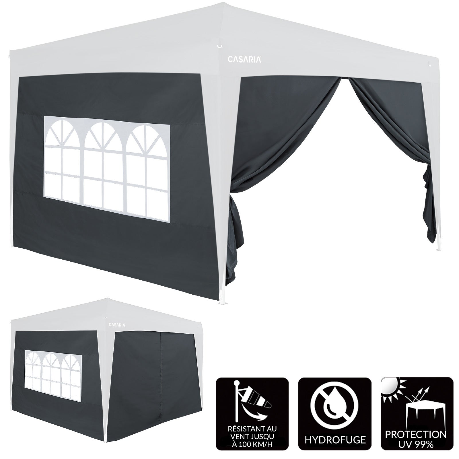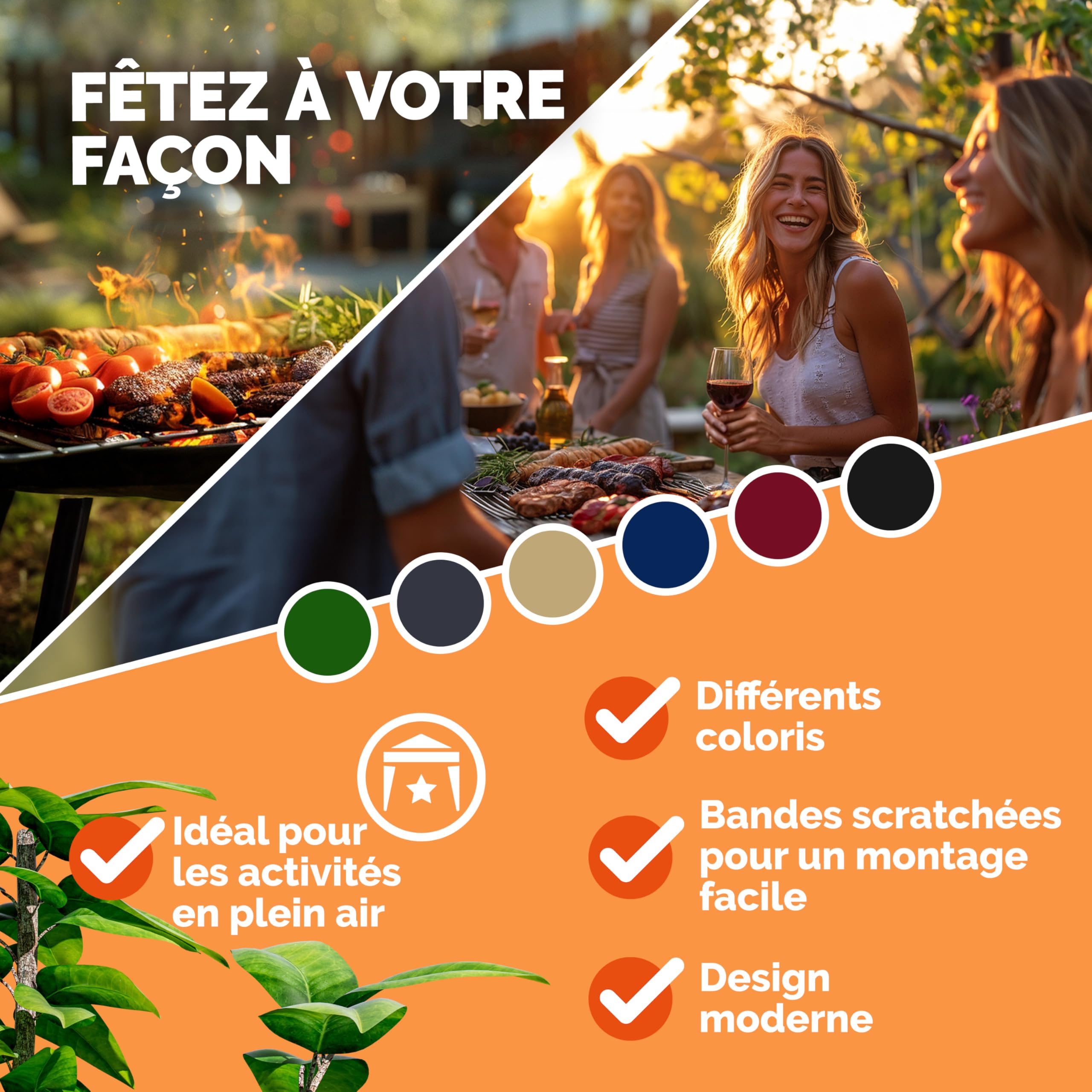 Tonnelle de jardin Easy Up pliable sans parois latérales Luxe 3x3m noir FACILE À INSTALLER : À l'aide des fermetures autoagrippantes, les parois latérales se fixent et s'enlèvent très rapidement du cadre du chapiteau. Protection Vent Soleil Jardin Casaria Tonnelle De Jardin 3x3m + 2x Parois Latérales Pergola Adossée COUPE PARFAITE : Les panneaux latéraux mesurent 3 x 3 m. Tente de réception 3x3m blanc Budget trois parois latérales tonnelle de... Tonnelle de jardin Easy Up pliable sans parois latérales Luxe 3x3m noir... De plus, elles disposent d'un revêtement PVC, ce qui les rend hydrofuges. Tu obtiens ainsi un espace ensoleillé avec un toit en plein air, qui offre à la fois protection et lumière. Elles permettent non seulement de laisser entrer la lumière, mais elles protègent aussi du vent. Elles créent de l'ombre et un moment convivial entre amis ou en famille. RÉSISTANTES AUX INTEMPÉRIES : Les bâches latérales robustes sont fabriquées en tissu Oxford 220D. Imperméables et résistantes aux intempéries, les parties latérales disposent d'une protection UV 50+ et sont composées à 100% de polyester.