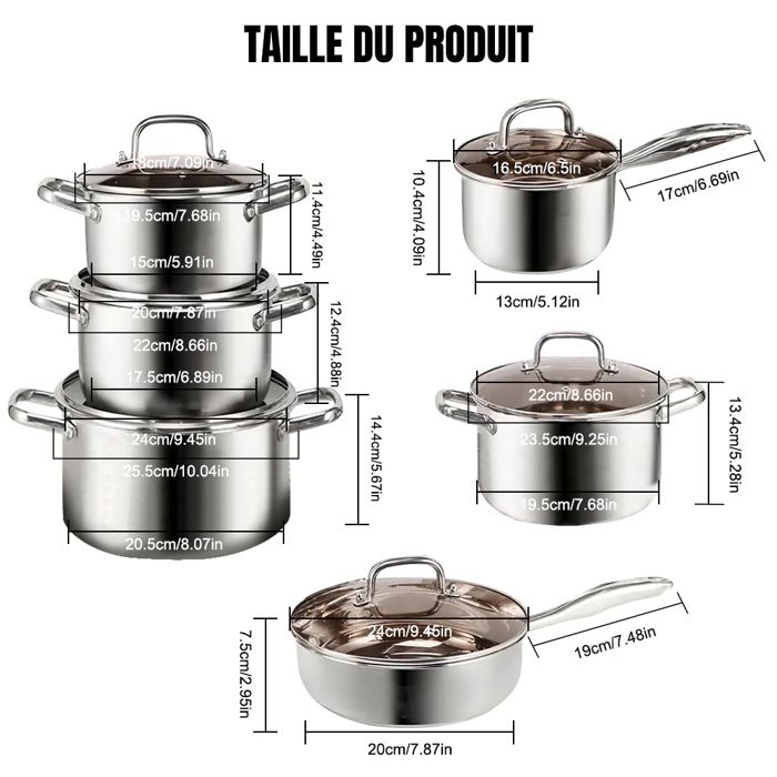 Ce système optimise la cuisson, aussi bien avec une cuisinière induction, à gaz, électrique ou des plaques vitrocéramique. Batterie de cuisine Casserole poele 12 pcs - Maison Dimensions intérieures (ØxH) : 16 x 9 cm, Volume : 1,8 l, Poids : 1 kg Dimensions intérieures (ØxH) : 24 x 13,5 cm, Volume : 6,1 l, Poids : 2 kg Cette batterie casserole comprend 1 sets de casseroles de différentes tailles à manche ou à poignée casserole. Dimensions intérieures (ØxH) : 20 x 11,5 cm, Volume : 3,6 l, Poids : 1,5 kg Un ensemble de plat inox avec couvercle qui s'adaptera parfaitement à votre plaque induction 2 feux, gaziniere, etc. FESSOSKO 4 Pieces Poignée de Couvercle de Casserole Poignée de... Compatible avec tous les types de feux : induction, gaz, électrique et vitrocéramique. Casserole moyenne 2 Dimensions avec couvercle : 31,5 x 21,5 x 18,5 cm CASSEROLE INOX DE QUALITÉ SUPÉRIEURE - Conçu en acier inoxydable haut de gamme, cette batterie de cuisine inox allie robustesse et élégance. Casserole electrique, casseroles pour induction, casserole camping, casserole vitrocéramique, …, cette batterie cuisine tout feux s'adapte à vos besoins. Les poignées sont ergonomiques, solides et résistantes à la chaleur. Caquelons Avec Couvercle Verre Casserole Tectake Batterie De Casseroles 9 Pièces Compatible Casserole Induction Grande casserole Dimensions avec couvercle : 35,5 x 25,5 x 20 cm BATTERIE DE CUISINE DE 9 PIÈCES - Ce set de casseroles Bologne II comprend une casserole à manche et 4 casseroles avec couvercle en verre, offrant ainsi une solution complète pour toutes vos plats cuisinés. Casserole moyenne 1 Dimensions avec couvercle : 31,5 x 21,5 x 16,5 cm Vous pourrez utiliser ce lot casserole au quotidien sans souci, car chaque casserole et couvercle casserole est compatible avec le lave-vaisselle., ., Un must-have parmi vos ustensiles de cuisine. COUVERCLE PRATIQUE AVEC ÉVACUATION DE VAPEUR - Le couvercle en verre avec évacuation de vapeur intégrée permet de garder un contrôle total sur votre cuisson. Conçues en acier inoxydable, ces casseroles sont résistantes aux rayures, à la corrosion et passables au lave-vaisselle. Données techniques : Casserole à manche Dimensions : 32 x 17,5 x 10 cm Compatible avec tous les types de feux : induction, gaz, électrique et vitrocéramique, cette batterie cuisine est parfaite pour toutes vos envies, que ce soit pour cuisiner rapidement ou préparer un repas festif. FOND SPIRALÉ - Chaque casserole de cette batterie cuisine inox est dotée d’un fond spiralé qui assure une répartition homogène de la chaleur. Petite casserole Dimensions avec couvercle : 26 x 17,5 x 15 cm Matériaux : acier inoxydable, verre Contenu de la livraison : 1 casserole à manche CAROTE Lot Poele et Casserole Induction, Poêles Antiadhésif 24/28c... Profitez d’une cuisson maîtrisée, même pour des plats complexes.
