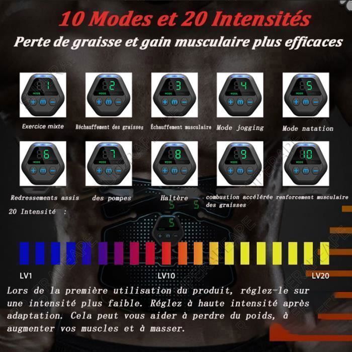 Electrostimulateur Musculaire Abdominal Electrostimulateur Musculaire EMS - Ceinture Abdominale Et Bras - Entraînement à Domaine - Multiple Modes Ceinture Ems Pro Electrostimulateur Musculaire Rechargeable Ceinture Ems Perte Graisse Ceinture Abdominale Electrostimulation Profey - 10 Modes 30 Niveaux - Électrodes Aluminium - USB - Homme/Femme Perte Graisse Abdominale Ceinture Brûle Calories Rechargeable Meilleure ceinture abdominale : TESMED Absolute Ceinture Abdominale EMS Les principales caractéristiques du produit Cette ceinture d'électrostimulation abdominale représente une excellente alternative pour travailler ses abdos sans contraintes. Fabriquée en Italie, elle combine innovation technologique et praticité d'utilisation pour un entraînement ciblé des muscles abdominaux... 【Ceinture Abdominale Electrostimulation】Cet appareil electrostimulateur musculaire abdo utilise la technologie avancée d'impulsion EMS, qui peut agir avec précision sur les groupes de muscles abdominaux pour promouvoir le mouvement musculaire et obtenir des effets d'entraînement, rendant l'exercice de fitness plus scientifique et plus efficace Sculptez vos abdos sans effort avec ce stimulateur musculaire EMS dernier cri ! La technologie par micro-courants active vos muscles en profondeur - 20... 【Utilisation à tout moment et en tout lieu】 L'électrostimulateur des muscles abdominaux est très léger et portable, vous pouvez l'utiliser lorsque vous lisez, regardez des films, faites du shopping à l'extérieur, etc La ceinture electrostimulation comporte 10 modes d'entraînement intégrés et 30 niveaux d'intensité pour répondre à vos besoins d'entraînement, qu'il s'agisse d'un échauffement de base, d'un entraînement à haute intensité ou d'une relaxation musculaire