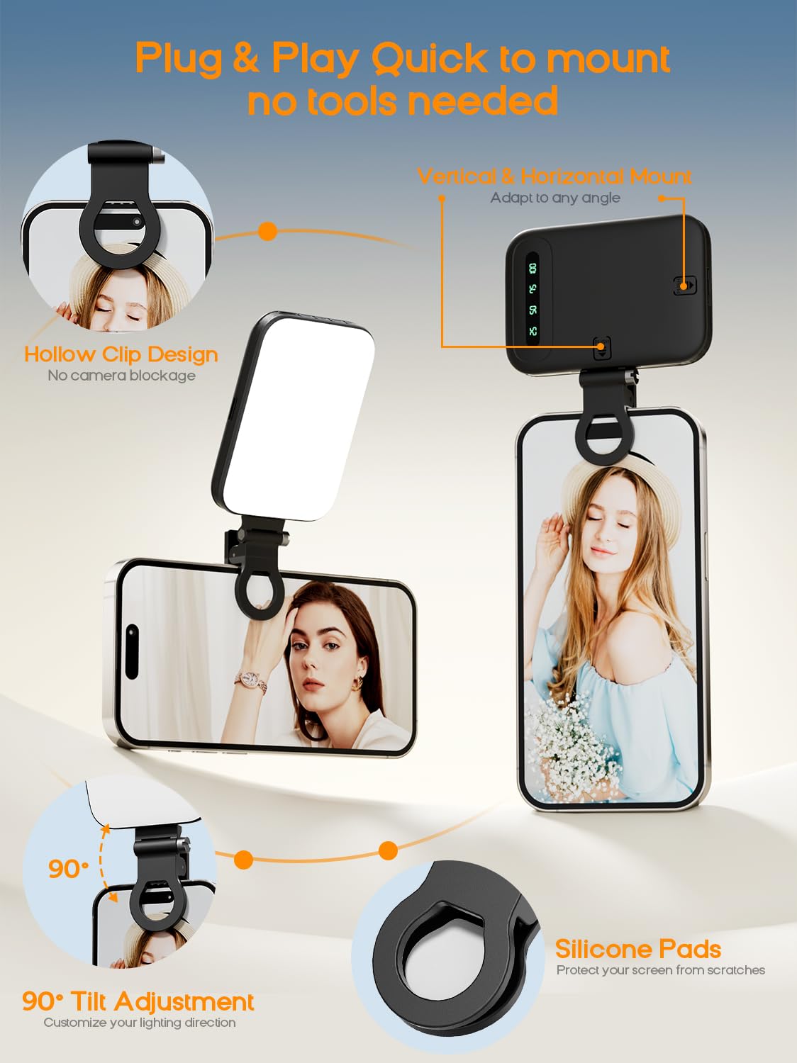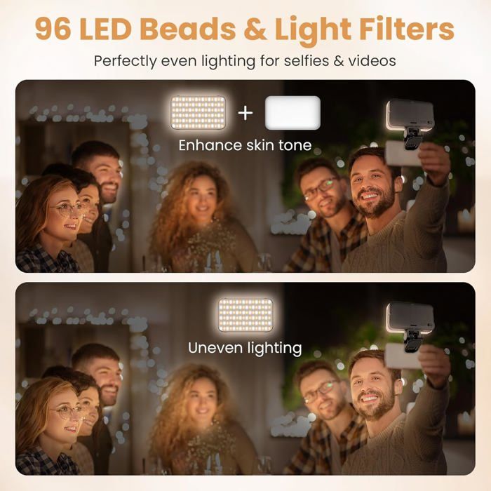 Ring Light Bague Portable Selfie Remplir La Lumière For Téléphone Mobile, Polyvalente Usb Répond à différentes ambiances. Light Ring Téléphone Ajustable Lumières De Selfie LED En Cercle Pour Téléphone Portable, Ordinateur Portable, Appareil Photo, éclairage Vidéo éclairage Téléphone Rechargeable La lumière froide met en valeur, la lumière chaude adoucit et la lumière naturelle rend plus naturel. Chargeur de téléphone sans fil Portable QI 10W avec luière LED pour Android/iOS pour iPhone... Description de Lampe selfie portable LED RGB pour téléphone, 3 modes d'éclairage, lampe vidéo Trois modes d'éclairage, plage de température de couleur de 2500K à 9500K pour apporter plus de flexibilité à la création Avec la plaque de couleur, il peut être combiné avec 20 types d'effets de lampe pour créer facilement une variété d'ambiances Réglage complet des couleurs de 0 à... Léger et pratique, parfait pour la photo nomade et les voyages Luminosité réglable de 0 % à 100 %, lumière uniforme et douce sans éblouissement, sans fatigue oculaire Installation: Fixez le clip sur la lampe via le trou (insérez dans le sens de la flèche), puis fixez la lumière sur le téléphone Autonomie ultra-longue: Batterie rechargeable 2000 mAh, 90 minutes d’utilisation à 100 % de luminosité. Design compact et portable: Dimensions ultra-compactes (10 x 6,5 x 1 cm), tient facilement dans une poche ou un sac. Un éclairage pour téléphone équivalent à un éclairage photo professionnel, adapté à divers besoins en photographie