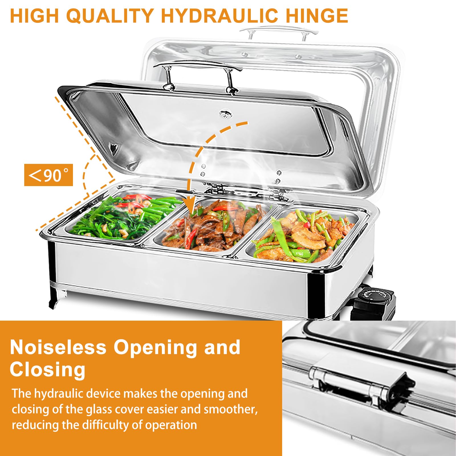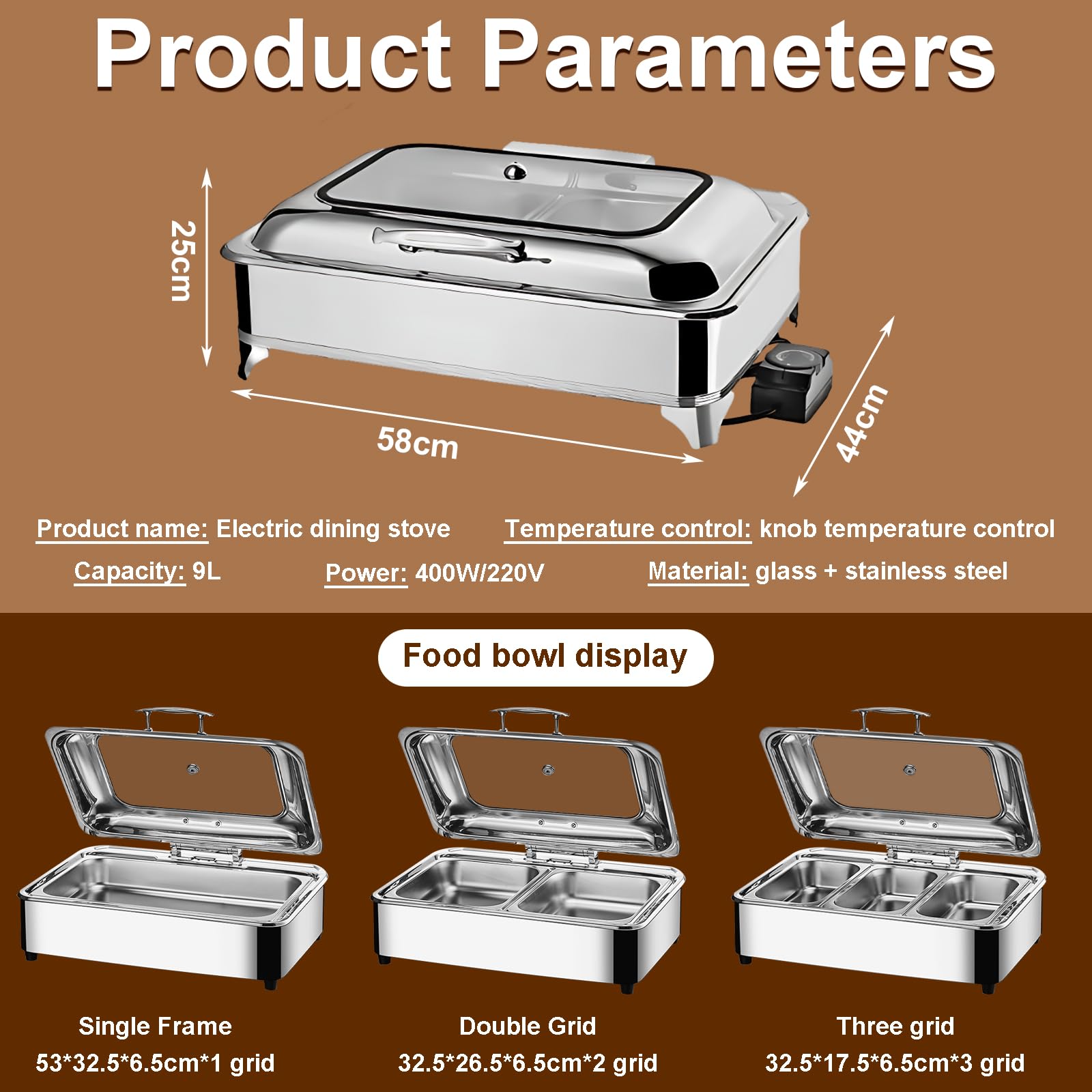 Chauffe-plats électrique 9L Aocay - Acier Inox 304 Réglable Mophorn chauffe-plats commercial, table à vapeur électrique de 18 L... Couvercle Verre Réglage Température Chafing Dish électrique 9L, Chauffe-plats De 600 W En Acier Inoxydable Chauffe Plat Electrique 【Acier inoxydable de haute qualité 】 Notre chauffe plat electrique buffet utilise un corps en acier inoxydable de haute qualité. 【Couvercle en verre visible 】 Ce modèle marmite chauffante buffet adopte un couvercle en verre transparent, qui évite les ouvertures fréquentes pour vérifier la cuisson, évite les pertes de chaleur et maintient les aliments à la température idéale. Plat Aluminium Jetable SOARS Chauffe Plat Électrique 450 W En Acier... Robuste et durable, il résiste à la corrosion et aux hautes températures, ne rouille pas et ne se déforme pas facilement, garantissant la sécurité alimentaire tout en facilitant le nettoyage et l'entretien quotidiens. Le couvercle est relié à un arbre d'amortissement hydraulique qui s'ouvre et se ferme en douceur et en silence, pour une conception ergonomique. De plus, en cas de panne, vous pouvez nous contacter pour un remplacement. Il chauffe rapidement et préserve les nutriments, tout en maintenant une température basse et une cuisson lente pour garantir des aliments savoureux et nutritifs.