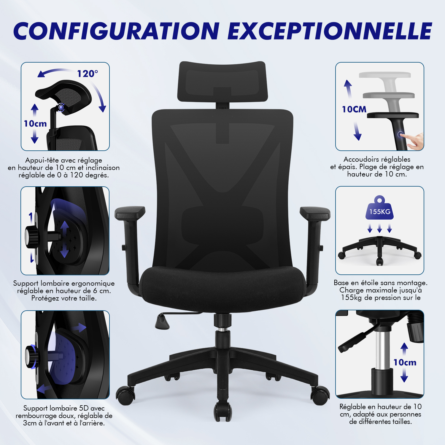 Siege Bureau Ergonomique Lombaire Cervicale Le test de 3 ans confirme la durabilité et la régulation de la température, même en été. Chaise Confort Dossier Filet Certifiée TÜV Chaise De Bureau Ergonomique Gaming, Cuir PU, Réglable En Hauteur, Repose-Pieds, Pivotante à 360° – Confort Optimal Pour Bureau à Domicile Et Gaming | Leroy Merlin Chaise Dossier Filet Respirant Soulage le cou, les épaules, le dos et la région lombaire. Chaise de bureau ergonomique : confort et soutien pour une posture saineTravailler longtemps assis peut être un vrai défi pour votre corps. Cette chaise de bureau ergonomique allie design intelligent et confort optimal pour vous aider à rester productif tout en prenant soin de votre posture. Sa structure métallique noire robuste, son dossier en maille respirante et son assise... Réglage polyvalent : Cette chaise de bureau ergonomique offre une hauteur d'assise réglable de 48 à 56 cm, un dossier inclinable à 155 ° et une assise pivotante à 360 ° avec roulettes. Trouvez ainsi la position idéale pour un travail concentré ou des pauses détente. Soutien optimal : Équipée d'un coussin lombaire amovible et d'un repose-pieds pratique, cette chaise d'ordinateur... Base silencieuse professionnelle : étoile en nylon renforcé + roulettes gainées de caoutchouc (< 30 dB). Réglable en 3 positions : hauteur réglable (53-58 cm), verrouillage d'inclinaison à 15°, rotation silencieuse à 360 °. Glisse en douceur et protège les sols délicats tels que le parquet ou le stratifié. Garantit un travail confortable même dans un espace limité. Parfait pour un travail concentré ou une courte détente. Le soutien lombaire renforcé offre un maintien ciblé et prévient la fatigue.