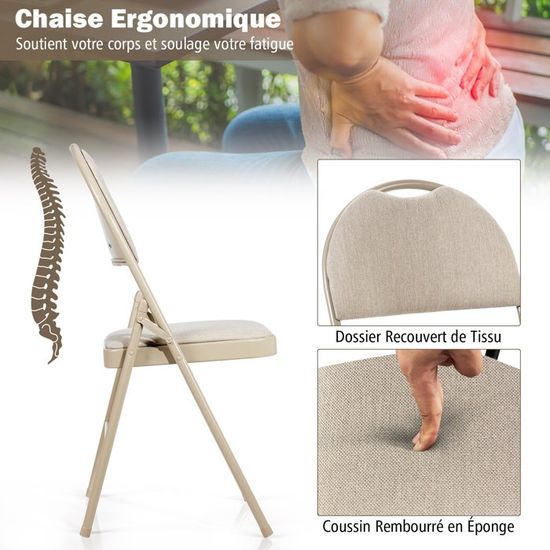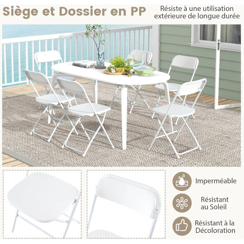 De plus, l'inclusion de rainures de drainage sur les sièges assure un séchage rapide, ce qui facilite l'entretien. Chaise De Camping Pliante Chaise Terrasse Exterieur COSTWAY Lot De 4 Chaises Pliantes En HDPE, Chaise De Jardin Exterieur Charge 160 Kg Poignee De Transport Cadre En Metal Chaise Empilable Pour Jardin Camping Salle A Manger Chaises Pliantes Hdpe Offrant confort et durabilité, ces chaises pliantes est doté de dossiers ergonomiques et de sièges profilés qui améliorent l'assise. Ces chaises pliantes se distinguent par un design élancé et minimaliste qui s'intègre dans tout environnement moderne. Design polyvalent et portable. Ces chaises rembourrées sont idéales pour tout type d'événement, des mariages et restaurants aux salles de conférence et écoles 【Structure Métallique Robuste】Conçues pour supporter jusqu'à 160 kg, les chaise de jardin sont dotées de cadres métalliques triangulaires fiables qui assurent stabilité et longévité. 【Pliage Pratique】Les chaises pliantes peuvent être pliées dans une taille compacte de 108 x 45,5 x 16 cm (L x l x H). COSTWAY Lot de 4 Chaises Pliantes en HDPE, Chaise de Jardin Exterieur... Idéales pour de longues heures d'assise lors d'événements, ces chaises promettent d'améliorer votre expérience d'assise et de réduire la tension. Le design pliante pratique permet un rangement compact et une installation sans avoir besoin d'assemblage. Lorsqu'elles ne sont pas utilisées, elle peuvent être rapidement empilées pour un rangement facile dans n'importe quel coin. COSTWAY Chaises pliantes, lot de 4, chaises d'invité avec Avec des poignées de transport intégrées, elles sont parfaites pour les mariages, les restaurants, les écoles, les salles de réunion. 【Matériau Tout Temps】Ces chaises de salle a manger portables sont fabriquées en matériau HDPE durable pour une utilisation en extérieur.