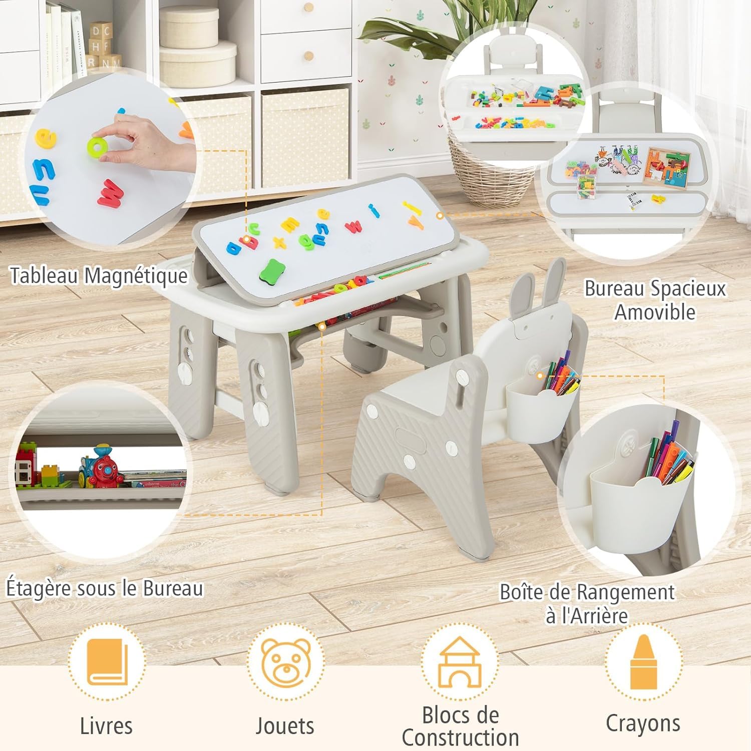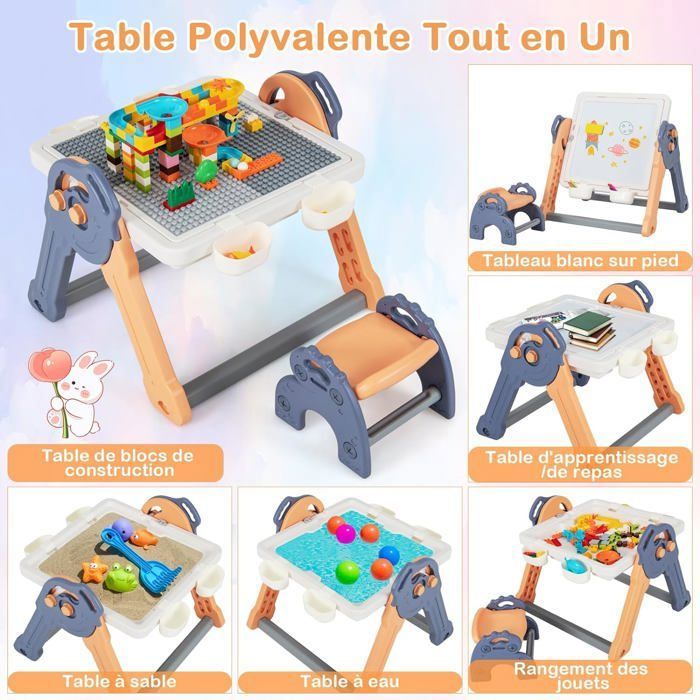 Il présente un tableau blanc magnétique pour les esquisses inspirées et une table de construction accueillant leurs créations de briques ludiques. Accessoires enrichissants : Cet ensemble est accompagné d'un florilège d'accessoires conçu pour stimuler l'esprit créatif des enfants : 66 blocs de construction, 6 marqueurs colorés, 2 boîtes de rangement, 1 gomme magnétique, et 1 planche de stickers. Conception adaptée aux enfants : Les paniers de rangement de chaque côté de la table facilitent l'accès aux fournitures artistiques, tandis que la poignée portable assure une mobilité sans effort. Caractéristiques : Comme chevalet d'art / table à manger/bureau/ table de blocs de construction Tableaux magnétiques effaçables et magnétiques offrant beaucoup de plaisir Fabriqué à partir de matériaux durables et adaptés aux enfants Construit dans une structure triangulaire avec une grande stabilité Cadeau pour les filles et les garçons pour améliorer la créativité et l'imagination Livré avec des blocs de construction, un effaceur, des marqueurs et des autocollants Spécifications : Couleur : bleu Matériau : HDPE + ABS Dimension du tabouret : 28 x 27 x 25 cm (L x l x H) Dimension du tableau blanc : 43 x 43 cm (L x l) Dimension de la table de construction : 53 x 49 x 54 cm (L x l x H) Hauteur du plateau : 42 cm Hauteur du chevalet : 69 cm Dimension du siège : 23 cm x 18 cm (L x l) Hauteur du siège : 18 cm Capacité de poids du plateau : 50 kg Capacité de poids de la chaise : 45 kg Âge approprié : 3 ans et plus Poids net : 4,5 kg Livraisons : 1 x chevalet d'art 1 x tabouret 66 x blocs de construction 1 x effaceur magnétique 6 x marqueurs colorés 1 x autocollant pour blocs de construction 1 x mode d’emploi GOPLUS Coiffeuse Enfant avec Tabouret, 2 en 1 Table de Maquillage avec Sa structure triangulaire confère une grande stabilité, éliminant les risques de renversement et prévenant efficacement les accidents. Avec son design ingénieux, ergonomique et entièrement sécurisé, vos enfants pourront exprimer librement leur créativité, tout en apprenant et grandissant dans la joie. GOPLUS 6 en 1 Table Enfant3 Ans et Chaise-Tableau Enfant Pliable... Cadeau idéal pour les enfants : Ce chevalet avec sièges est une idée-cadeau qui saura enchanter tous les enfants, en toutes occasions – anniversaires, fêtes ou simplement pour célébrer un moment spécial. Découvrez l'univers enchanté de notre Table d'Activités Éléphantastique ! Il est compatible avec les marques de briques de construction les plus prisées, offrant ainsi une plateforme idéale pour que les petits puissent éveiller leur imagination. Jeu Créatif Tout-petits GOPLUS Table Enfant Avec Chaises Pour Enfant 3 En 1 Chevalet, Bureau Chevalet Peinture Conception compacte et stable🫧 : Les pieds de chaise sont suffisament épais dans l'ensemble, table et 2 chaises en matière non glissante. Avec des coins arrondis afin d'éviter de se blesser, le dossier élargi permet à votre enfant de protégé son dos et de garantir sa sécurité lorsque 'il est en position assise De plus, la surface imperméable se nettoie aisément, préservant ainsi votre intérieur des tâches.