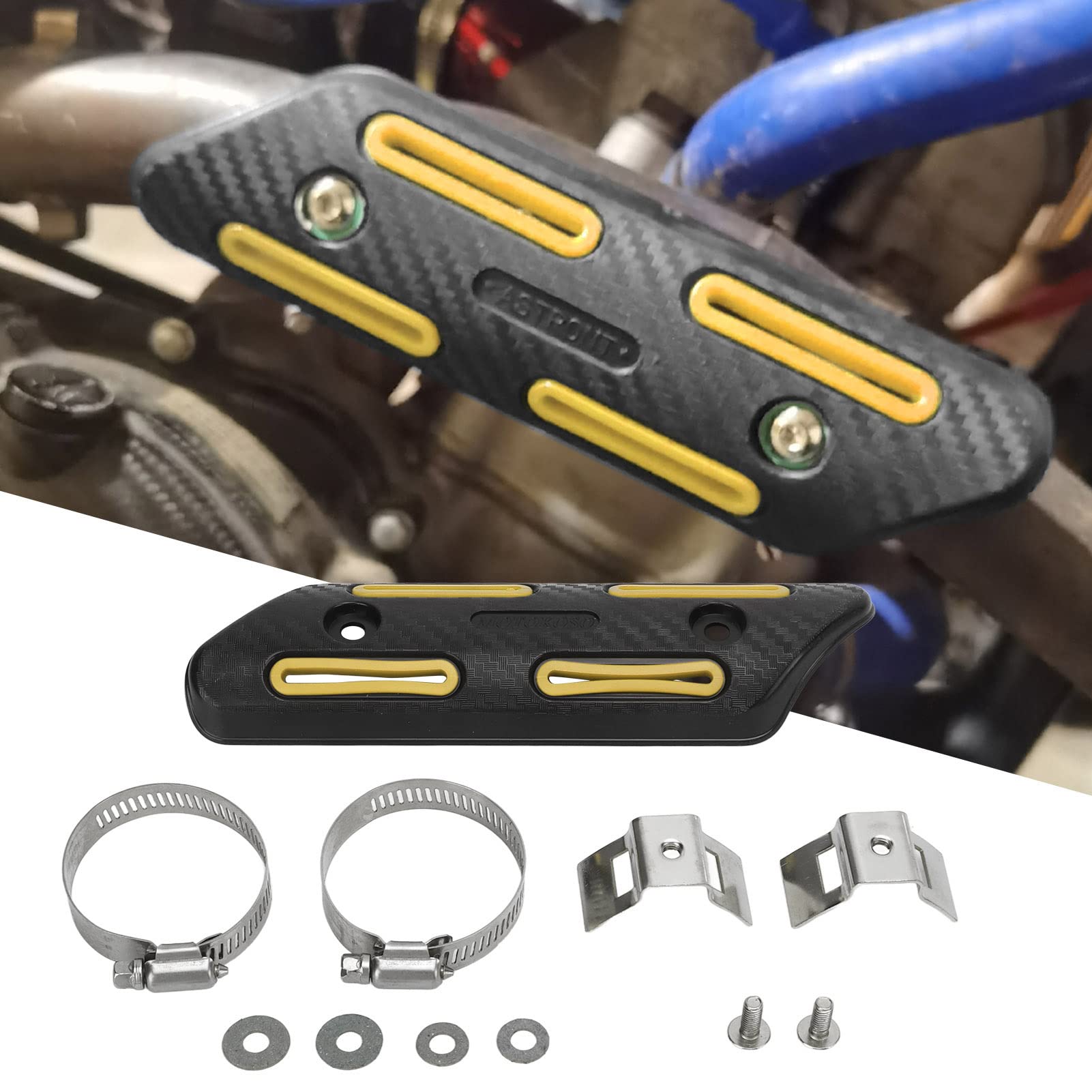 Fonction : le bouclier thermique d'échappement protégera les bottes et les vêtements du direct avec le tuyau d'échappement. Dissipateur Chaleur Moto 4 Temps Protection Pare Chaleur échappement Moto Pare-Chaleur Échappement Protection Tuyau échappement Spécification:Type d'article: Bouclier thermique du tuyau d'échappementMatériau: ABSLongueur: env., 190 mm/7,48 poucesLargeur: env. Décoration personnalisée : bouclier thermique de tuyau de silencieux avec une apparence élégante, améliorez l'apparence de votre moto, idéal pour la décoration Caractéristique: La conception professionnelle des trous de dissipation thermique réalise parfaitement la dissipation thermique du silencieux d'échappement et prolonge la durée de vie du système d'échappement. Protection du corps : Protégez les bottes et les vêtements du direct avec le tuyau d'échappement. Protecteur de Chaleur D'échappement, Couvercle D'isolation de Bouclier... Bonne dissipation thermique : la conception professionnelle des trous de dissipation thermique réalise parfaitement la dissipation thermique du silencieux d'échappement et prolonge la durée de vie du système d'échappement. 55mm/2,17poucesPlage d'extension de la pince: env. vous protéger, vous ou vos passagers, contre les blessures. Protection de collecteur universelle 4T 25-51 mm/0,98-2inTuyau d'échappement applicable: convient à tous les tuyaux d'échappement d'un diamètre de 25-51 mmModèles applicables: toutes les motos à quatre temps, VTT, UTV, véhicules tout-terrain, etc., . Universel : s'adapte à tous les tuyaux d'échappement de 25 à 51 mm de diamètre, s'adapte à toutes les motos 4 temps, VTT, UTV, motos hors route, etc.