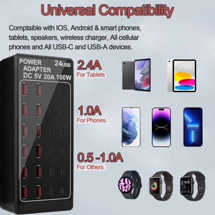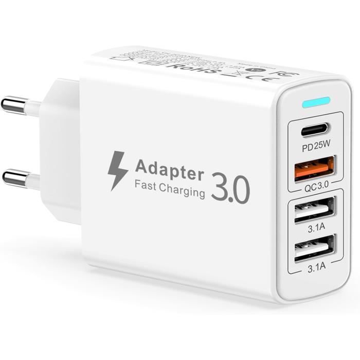 ultiprise USB C, Prise ultiple avec Interrupteur Individuel ultiprise urale 4 Prises et 3 Il peut charger 5 appareils en même temps, avec une puissance de sortie totale allant jusqu'à 65 W, répondant aux besoins de charge de plusieurs appareils en même temps. Prise Multiple Usb Chargeur Usb C Rapide 40W,Prise Usb C Multiple Chargeur Usb Multiple Avec Pd&Qc3.0, Adaptateur Chargeur Rapide 5 Ports Fabriqué à partir de matériaux ignifuges, il empêche efficacement les courts-circuits et les fluctuations de tension, garantissant un processus de charge sûr et sans souci. 1.The USB-C port supports 20W Power Delivery fast charging protocol, which charges three times faster than a conventional 5W charger. Intelligently identify the type of device, automatically match the optimal charging power and significantly reduce the waiting time for charging Chargeur USB C Rapide, 40W 4-Port Prise USB Multiple avec PD&QC3.0 Adaptateur Secteur USB C Type... La conception compacte et légère du corps ne pèse que 150 grammes et peut être facilement mise dans un sac à dos ou une valise, ce qui en fait un compagnon idéal pour les voyages d'affaires. Identifiez intelligemment le type d'appareil, faites correspondre automatiquement la puissance de charge optimale et réduisez considérablement le temps d'attente de charge. 【Chargeur USB Rapide】Un seul chargeur peut répondre aux besoins de charge de plusieurs appareils tels que les téléphones portables, les tablettes, les écouteurs, etc. Identifiez intelligemment le type d'appareil, faites correspondre automatiquement la puissance de charge optimale et réduisez considérablement le temps d'attente de charge., 2., Mécanisme de protection quadruple intégré contre les surcharges, les surtensions, les surintensités et les surchauffes, et arrêt automatique une fois complètement chargé. 【Chargeur USB C】Mécanisme de protection quadruple intégré contre les surcharges, les surtensions, les surintensités et les surchauffes, et arrêt automatique une fois complètement chargé. Caractéristiques principales : 5 ports de charge : 1 port USB-C PD (Power Delivery) 1 port QC3., 0 (Quick Charge 3., 0) 2 ports USB 3., 1A 1 port USB standard Avantages : 1., Le port USB-C prend en charge le protocole de charge rapide Power Delivery 20 W, qui charge trois fois plus rapidement qu'un chargeur 5 W classique.