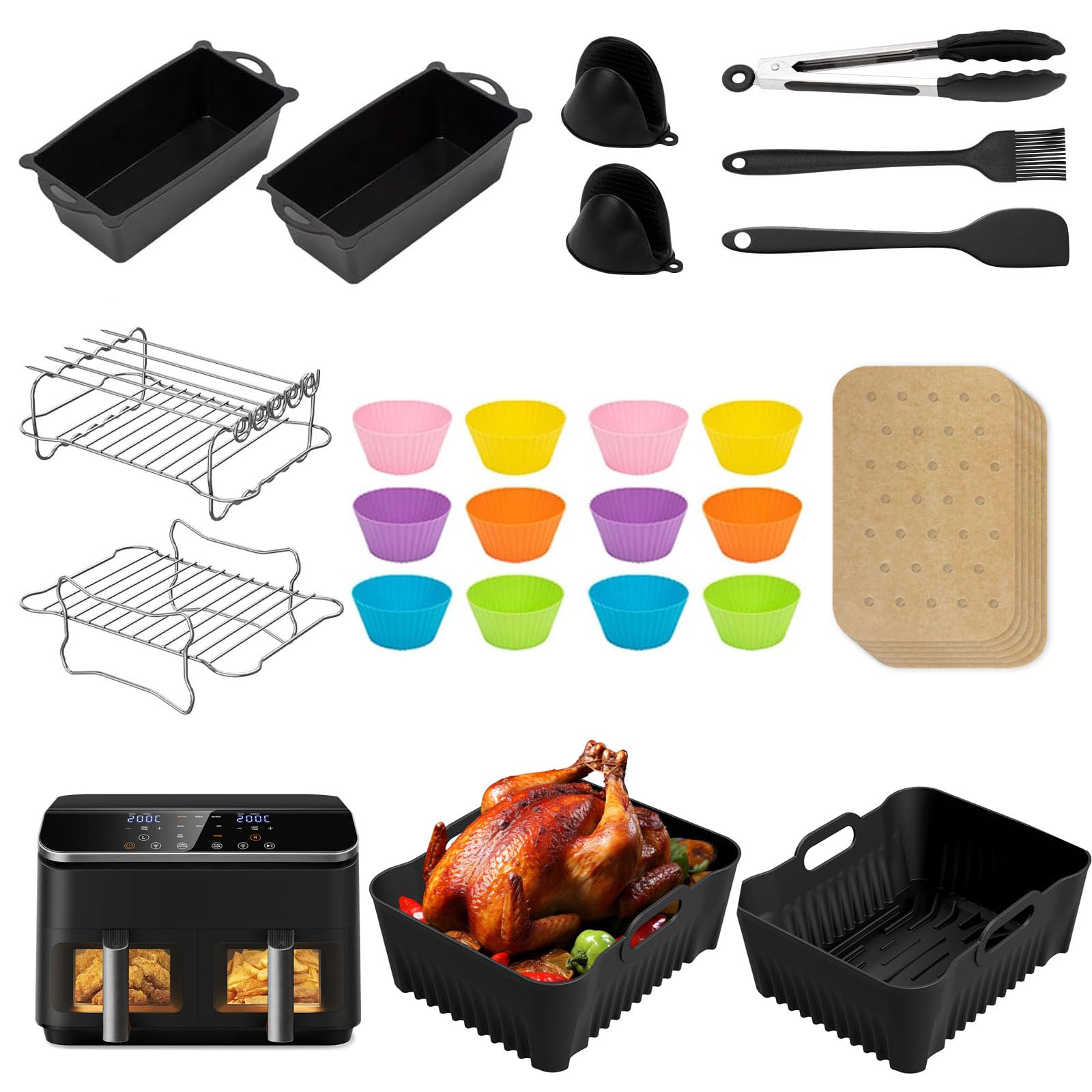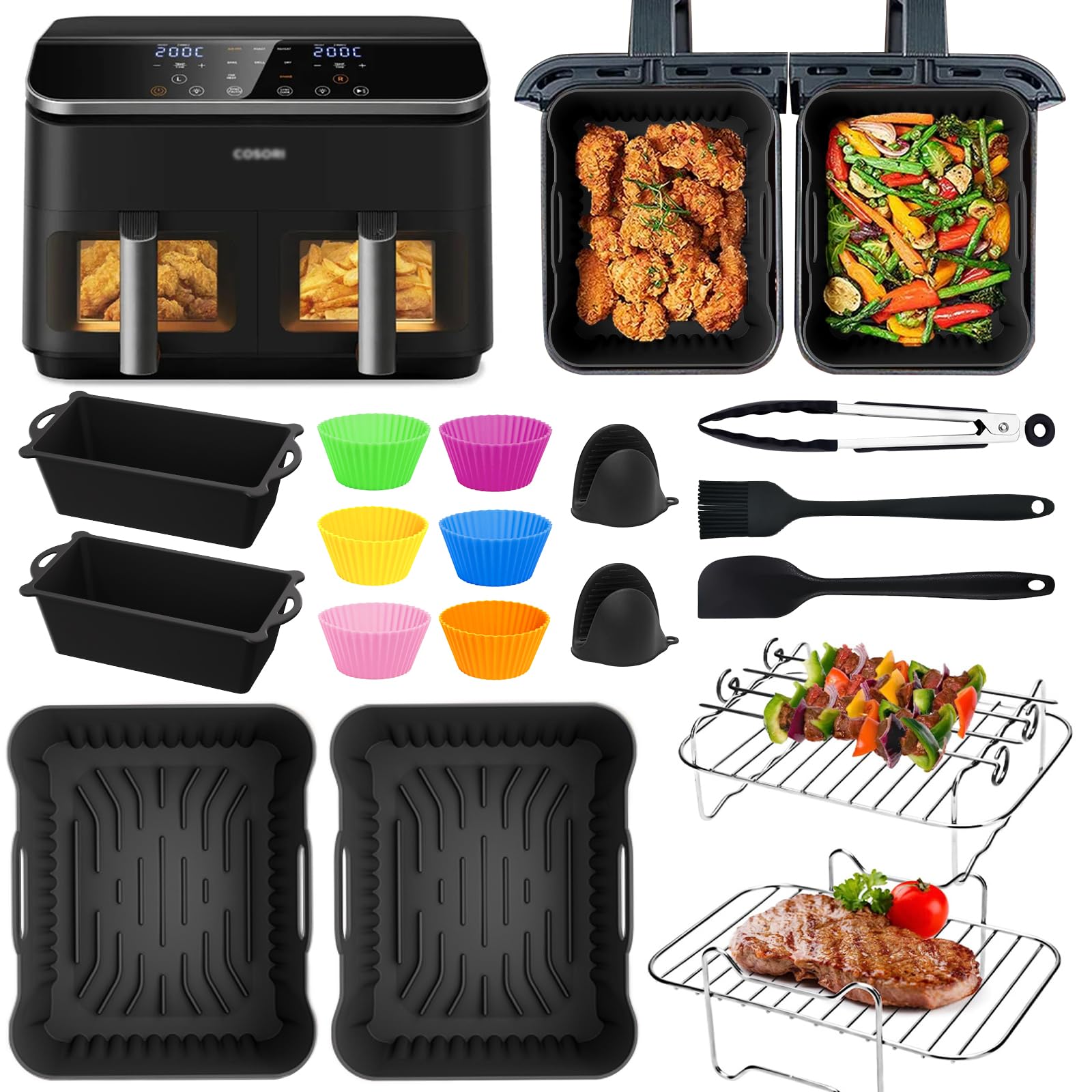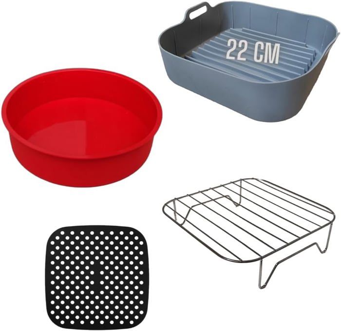 Accessoires pour friteuse à air chaud COSORI, double zone 8.5 L, réutilisables, comprenant des moules en silicone, une grille et des moules à pain pour friteuse à air chaud COSORI CAF-R901-AE Kit d'accessoires Airfryer de 25 pièces : 2 * friteuse à air doublure en silicone, 8 * moules à gâteau en silicone, 1 * boîte à toast, 1 * brosse en silicone, 1 * pince en silicone, 1 * moule à gâteau avec couvercle, 1 * moule à pain antiadhésif, 1 * support à brochettes en acier inoxydable (avec 4 brochettes), 1 * grille de cuisson en acier inoxydable, 1 * support à brochettes en acier inoxydable Acier inoxydable (avec 4 brochettes), 1 moule en silicone, 30 doublures en papier, un flacon pulvérisateur d'huile. Grille Acier Inox Friteuse Friteuse À Air Chaud 5,5 L Xxl, Accessoires De Friteuse À Air Chaud 9 Kit Accessoires Airfryer Il contient tout ce dont vous avez besoin pour une utilisation professionnelle de votre Airfryer Cette grille pour friteuse à air est conçue pour améliorer vos expériences culinaires. Compatible avec les modèles Cosori Dual Blaze et Turboblaze, elle permet... Airfryer Accessoires Pour Cosori 5,5 L, 2 Moules En Silicone Pour Friteuse À Air Chaud, Airfryer... Matériaux de haute qualité : les accessoires de friteuse à air chaud COSORI sont fabriqués en silicone de qualité alimentaire de haute qualité et en acier inoxydable 304, sans BPA. Grâce à son design bien pensé, vous pouvez préparer différents plats en même temps et gagner un temps précieux. Ces matériaux résistants à la chaleur peuvent supporter jusqu'à 240 °C, assurant une répartition uniforme de la chaleur et une durée de vie plus longue, pour une cuisson sûre et saine. Résistance à la chaleur, maximum 240 ° C Facile à nettoyer : toutes les pièces passent au lave-vaisselle pour un nettoyage facile Rendez votre friteuse à air chaud plus fonctionnelle et polyvalente avec ce kit d'accessoires de qualité supérieure. Facile à nettoyer : tous les accessoires de la friteuse à air chaud COSORI se nettoient facilement à la main ou au lave-vaisselle. Principales caractéristiques : Compatibilité : le moule en silicone Sonser pour friteuse à air chaud TeUse est spécialement conçu pour cosori 8,5 L Dual Zone Air Fryer XXL (CAF-R901-AEU) Polyvalent : convient pour la cuisson à air chaud, les fours à micro-ondes Matériaux de haute qualité : silicone de qualité alimentaire, acier inoxydable 304 BPA No.