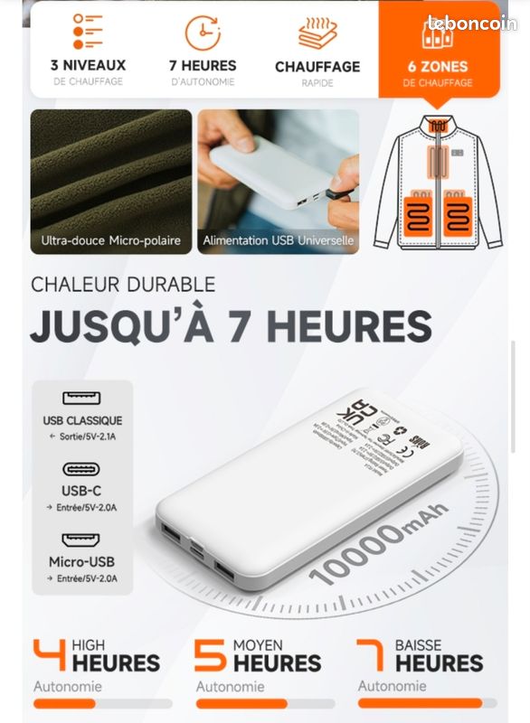 Pourquoi la lecture est-elle plus basse au début ? L'efficacité thermique dépend de l'accumulation de chaleur sous l'isolation. Kit complet veste chauffante polaire Homme, taille XL - Flex 3 Niveaux de Chaleur : Choisissez 40°C, 50°C ou 60°C. Veste Lavable Machine Homme Femme Veste Chauffante électrique Gilet Chauffant AGUG USB - 3 Niveaux De Chauffage - Homme/Femme - Lavable Chauffage USB Veste Thermique Alimentation Power Bank Ils donnent souvent des lectures imprécises et plus basses lorsqu'ils sont utilisés sur des matériaux comme les tissus chauffants. Portez-les quelques minutes : si vous vous sentez bien au chaud, c’est que tout fonctionne parfaitement. Gilet chauffant, veste chauffante homme femme, 10000mAh 5V USB micro polaire blouson chauffant avec batterie incluse, manteau Électrique avec 3 Niveau de... Conçu pour un entretien facile. Confort et Style en Polaire : Notre veste chauffante est entièrement doublée d'une micro-polaire ultra-douce pour un confort 360°. Les batteries externes sont spécialement conçues pour alimenter les éléments chauffants intégrés à la veste, vous offrant ainsi un confort optimal. Découvrez... Ceci confirme l'excellente accumulation et rétention de chaleur du produit, démontrant une performance thermique optimale. Après utilisation prolongée, la température affichée peut dépasser le réglage initial de 3 à 5°C. Alimentez le veste thermique avec n'importe quelle power bank USB (5V/2., 1A) pour une liberté totale. Pourquoi votre thermomètre affiche une basse température? Les thermomètres infrarouges grand public (comme les pistolets frontaux) sont calibrés pour la peau humaine. Lavage Machine Simplissime : Fermez le capuchon étanche et lavez.