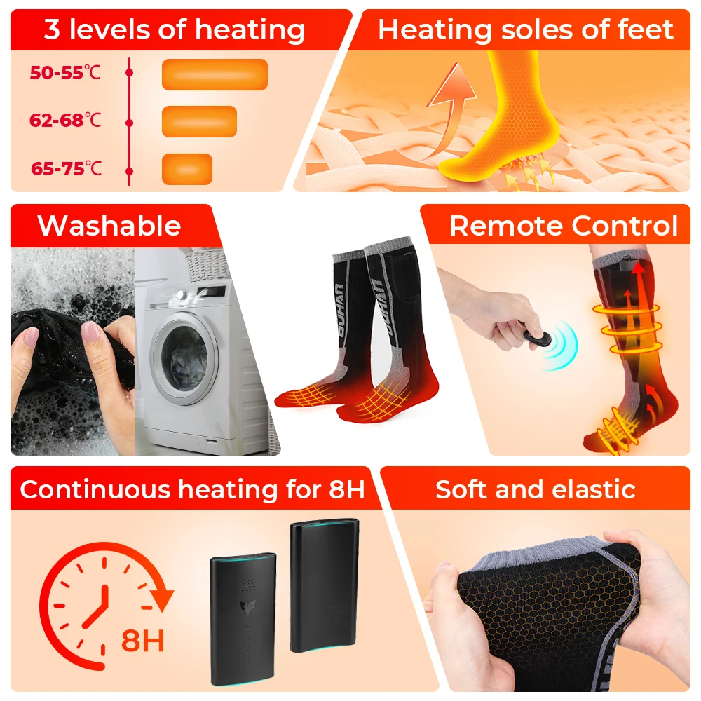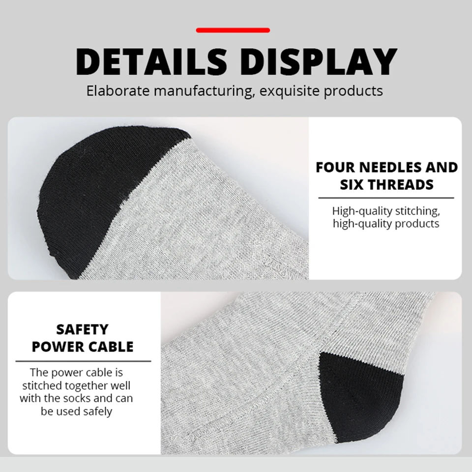 Chaussettes Chauffantes 5000mah App Chaussettes Chauffantes Avec 5000mAh Rechargeable, APP Chaussette Chaussettes Chauffantes App Mophorn Chaussettes chauffantes rechargeables avec batterie 5000 mAh, 4 Chaussette Chauffante - Marque - Double chauffage - Haute, moyenne et... 【Mode Double Contrôle】 Notre chaussette chauffante prend en charge l'application App et le contrôle manuel, vous permettant de régler précisément la température sur quatre niveaux : 45°C, 55°C, 60°C et 65°C. 【4 Niveaux de Chauffage】 Quatre réglages de température flexibles sont disponibles pour répondre à vos besoins de chaleur dans différentes situations : Faible (45°C, 7-8 heures), Moyen (55°C, 5-6 heures), Élevé (60°C, 4-5 heures) et Intense (65°C, 3-4 heures). 【Chauffage Rapide, Lavable】 Chaussettes chauffantes utilise un élément chauffant de qualité supérieure et un tissu respirant et isolant pour une chaleur uniforme et rapide, offrant une chaleur uniforme à la plante des pieds, à la voûte plantaire et aux orteils. Chaque port de charge prend en charge un courant stable de 1 A, garantissant un fonctionnement sûr et efficace, répondant facilement à vos besoins de chaleur en extérieur tout au long de la journée. Le matériau élastique renforcé épouse la forme. Après lavage, séchez et réutilisez. Son design élégant et pratique en fait un cadeau réconfortant pour les amis et la famille pendant les vacances de Noël et du Nouvel An, gardant tout le monde au chaud pendant le froid de l'hiver. Cadeau parfait pour les aventures d'hiver : nos chaussettes chauffantes à batterie sont idéales pour les activités d'hiver en plein air comme le patinage, la chasse, le ski, le snowboard, la randonnée, le pelletage de la neige, la moto, la pêche ou même la promenade de votre chien