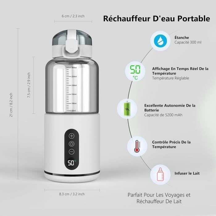 Même lorsque la batterie est déchargée, le matériau thermique 6 couches garde le liquide au chaud. Chauffe Biberon, Chauffe-biberon Portable pour Bébés, Rechargeable USB... Design élégant et pratique :Son design transparent est à la fois stylé et attrayant. L'affichage LED montre la température actuelle, facilitant l'utilisation pour atteindre la température souhaitée. Reveal Baby Chauffe-biberon Portable Rapide - Pour Lait/Eau/Café/Thé Chauffe Lait Température Réglable 55°C Équipé d'une charge rapide USB-C, il se recharge complètement en 2 à 2,5 heures avec un chargeur 30W (chargeur non inclus; la vitesse de charge dépend de l'adaptateur utilisé). Conçu pour les mamans de nouveau-nés, ce chauffe-lait portable de 500 ml est le compagnon idéal pour les déplacements. Chauffe-biberon rechargeable pour voyage :Ce chauffe-biberon portable de 500ml s'intègre facilement dans un sac à main et dispose d'un couvercle verrouillable étanche. Le couvercle protège l'intérieur et peut servir de tasse si nécessaire, idéal pour les voyages. Une bande latérale permet un accrochage facile pour un rangement optimisé. Idéal pour garder vos boissons au chaud en déplacement - parfait pour le café, le lait ou les biberons pendant les trajets ou voyages. Une charge complète peut chauffer 150ml d'eau jusqu'à 8 fois, ou 300ml jusqu'à 5 fois (de 25°C à 45°C). À la recherche du meilleur chauffe-biberon portable pour vos sorties ? Découvrez notre guide 2025 complet et trouvez l'appareil parfait pour vous et bébé Qu'il s'agisse d'eau ou de lait, ce chauffe-biberon portable les réchauffe facilement. Note d'utilisation : Après avoir chauffé du lait, nettoyez rapidement avec un produit adapté pour éviter la croissance bactérienne et les odeurs désagréables. Chauffe-biberon Portable, chauffe-tasse à lait, sac d'alimentation pour