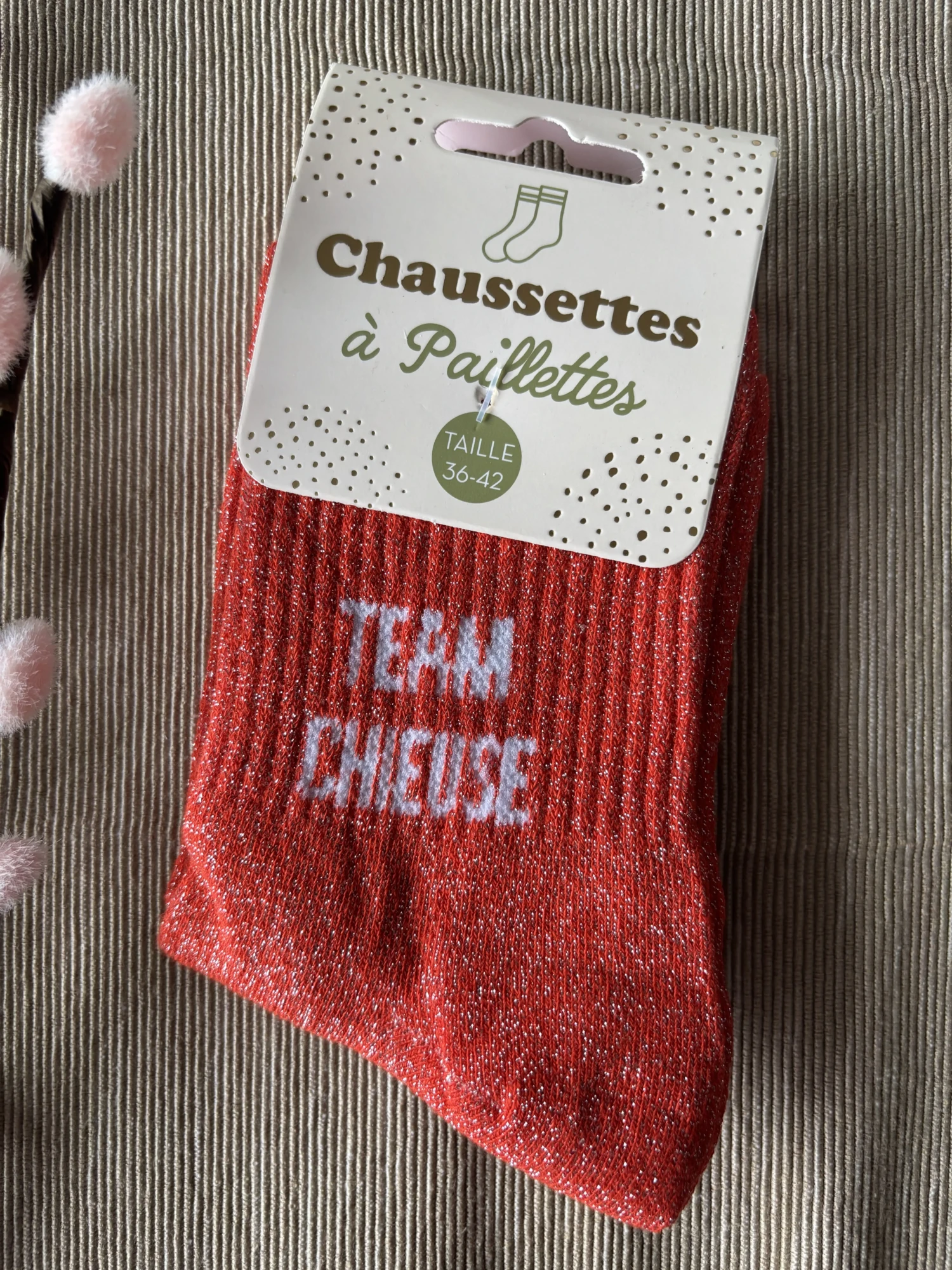 Découvrez nos offres Chaussettes à paillettes : large sélection de produits au meilleur prix | Livraison gratuite à partir de 10€* | Entreprise française... Le packaging est une petite carte colorée à hélice rattachée au produit (hangtag)., Thématique Mode Chaussettes paillettes team chieuse, one_size, Carton, Multicolore, moderne Chaussette Paillette Chaussettes Femme Beige à Paillettes – Message "Team Connasse" – Taille 36/42 Chaussettes Paillettes Dimensions du packaging : L., 7,20 cm / l., 1,50 cm / H., 20,50 cm. Nos chaussettes chaudes sont parfaites : ✓ Douces et moelleuses ✓ Maintiennent les pieds bien au chaud ✓ Parfaites pour les soirées cocooning... Taille : 36-42 Ces chaussettes à paillettes avec la mention team chieuse en blanc sont la garantie d'un look stylé Référence : CD8425V84 Dimensions du produit : L., 7,20 cm / l., 1,50 cm / H., 20,50 cm. Arrivage aujourd'hui de chaussettes paillettes, dont des nouveaux modèles 🤩, #gifi #lunel #paillettes