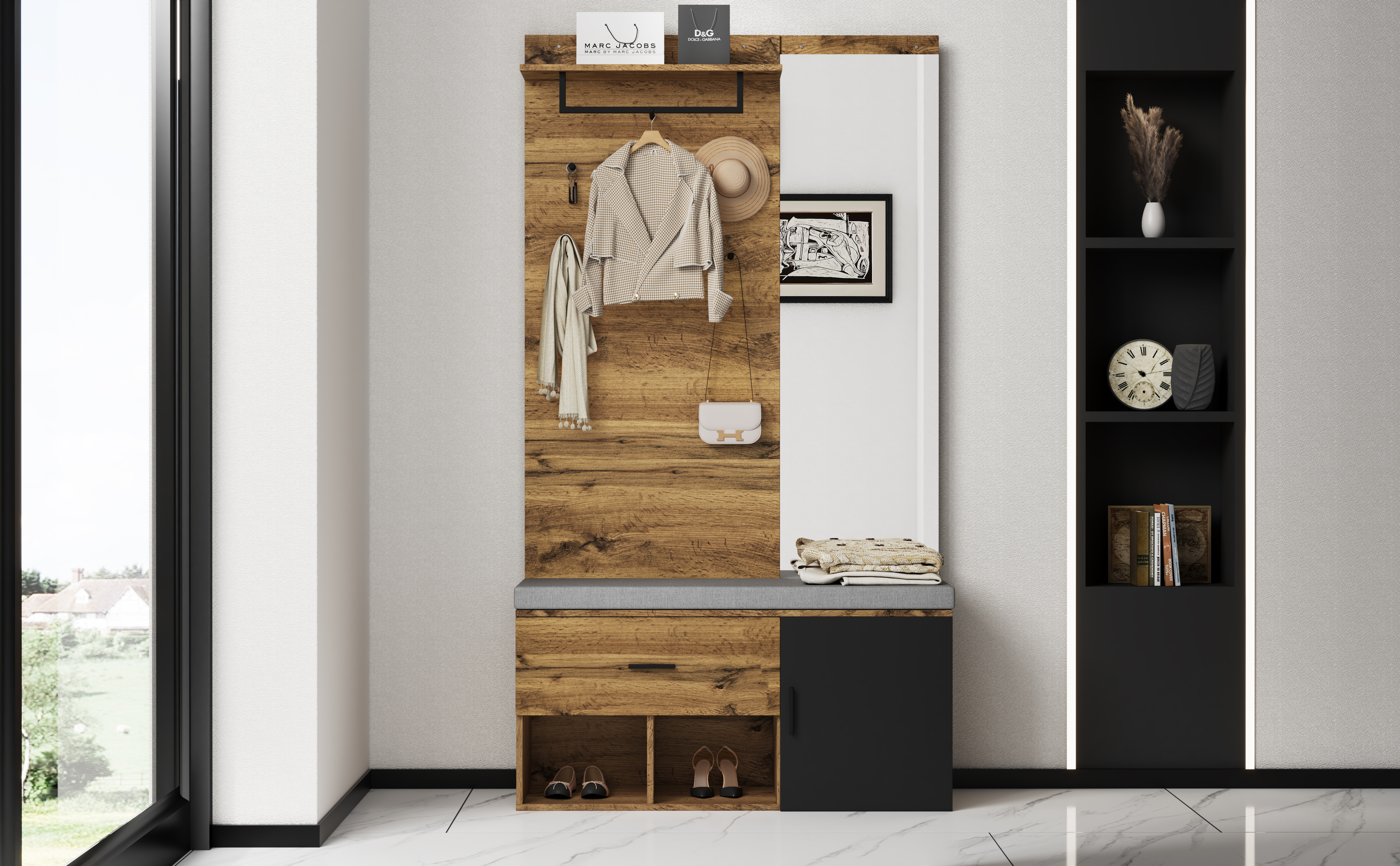 Miroir en une seule pièce : Les portes sont équipées d'un miroir intégré qui non seulement ajoute une profondeur visuelle à la pièce,mais sert également d'outil pratique pour organiser vos vêtements quotidiens. Cet ensemble d'armoires est très pratique et rehausse visuellement l'entrée. Cette armoire d'entrée est également équipée d'un siège pratique pour rendre l'enfilage des chaussures plus confortable. En outre,ce meuble d'entrée comporte des compartiments de rangement pour les objets décoratifs,les accessoires ou d'autres articles,ce qui garantit que vos affaires sont organisées et facilement accessibles. Qu'il s'agisse d'un petit ou d'un grand couloir,cet ensemble de meubles conviendra parfaitement. Vous trouverez dans cette catégorie tous nos meubles d'entrée, penderies, meubles à chaussures, petites armoires et guéridons... Une sélection de nos meilleurs produits chez nos meilleurs fournisseurs Facile à assembler : Ce produit est livré avec des instructions d'installation détaillées et des étapes d'installation claires pour un assemblage facile. Espace de rangement spacieux: Cette armoire d'entrée est livrée avec deux armoires à chaussures,deux compartiments à chaussures spacieux pour 9 à 12 paires de chaussures,et des supports à chaussures pour fournir un espace confortable pour changer de chaussures. Cet ensemble d'armoires combine fonctionnalité, style et praticité,ce qui en fait un meuble élégant et pratique. Meuble Entree Porte Manteau Ensemble Portemanteau Mural Miroir Meuble à Chaussures Avec Tiroir Bois Marron Foncé Meuble Porte-manteau Et Chaussures Cet ensemble d'armoires combine fonctionnalité, style et praticité,ce qui en fait un meuble élégant et pratique.Cet ensemble d'armoires est très pratique et rehausse visuellement l'entrée.Cette armoire d'entrée est livrée avec deux armoires à chaussures dotées de deux compartiments spacieux pour ranger 9 à 12 paires de chaussures... La combinaison de couleurs classiques ne met pas seulement en valeur l'esthétique générale de la pièce,mais s'intègre aussi facilement dans une variété de styles d'intérieur,mettant en valeur vos goûts et votre style. facilitant ainsi l'entrée et la sortie de votre maison. Quatre patères et un porte-manteau supplémentaire offrent suffisamment d'espace pour les manteaux,les sacs,etc. Ce produit sera expédié en 2 colis et peut ne pas arriver en même temps,veuillez être patient. Meuble à Chaussures Multifonctionnelle - Avec Un Siège Rembourré - Avec 4 Portes Et 1 Tiroir Noir 96569110 Une solution pratique : la combinaison d'un miroir,de patères et d'un portemanteau fait de cet ensemble une entrée complète. En raison de la lumière, il peut y avoir une différence de couleur entre la photo du produit et l'objet réel, veuillez vous référer à l'objet réel reçu. Si les clients rencontrent des problèmes pendant le processus d'installation,veuillez nous contacter dès que possible. Poids total du produit : 46kg Matériau : panneaux de particules + MDF Quantité d'emballage : 2 Autres outils nécessaires : Tous les outils sont inclus Remarque : Toutes les dimensions sont approximatives.