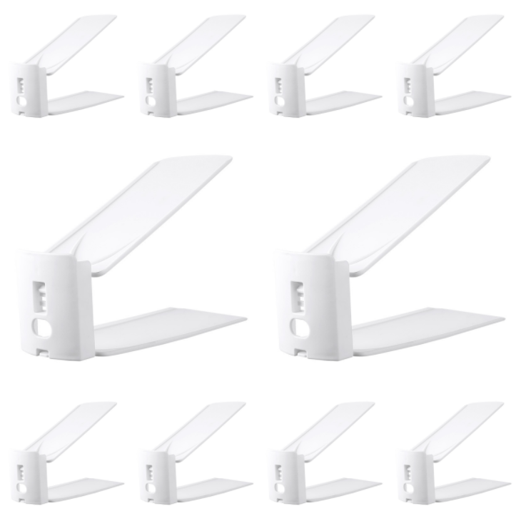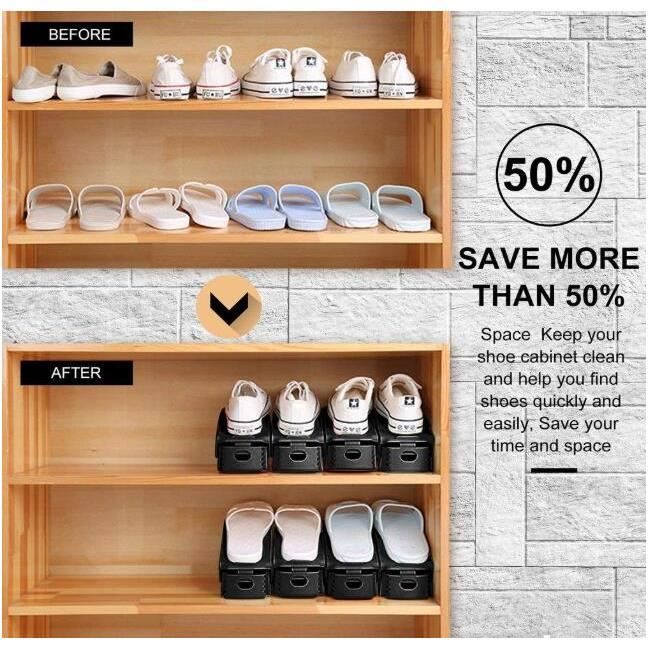 Range Chaussures Double étage 10PCS Support à Chaussures Réglables Organiseur De Chaussures Empiler Supports Chaussures 10Pcs Rangement Chaussure Range Chaussures Gain De Place Réglable à chaussures,pour empiler les chaussures réglable Organiseur... 【TROIS NIVEAUX DE REGLAGE DE LA HAUTEUR】 : l'étagère à chaussures réglable peut être ajustée à la hauteur réelle de vos chaussures. 【ESIGN ANTIDÉRAPANT】 : l'étagère à chaussures antidérapante a des blocs et des particules sur la surface pour augmenter la friction. 【ROBUSTE ET LONGUE DUREE】 : le rangement chaussure est fabriqué en plastique PP vert non toxique de haute qualité et durable, ce qui lui confère une durée de vie plus longue et une capacité de charge plus élevée. 【GAIN DE PLACE】: dimensions (L x l x H) : 25 x 9 x 15 cm, couleur : noir/blanc, lot disponible : 10 pièces, le double étagère à chaussures est conçue avec deux étages, vous pouvez diviser l'étagère à chaussures en deux étages pour économisant ainsi 50% d'espace. Il ne sera pas endommagé par une forte pression ou une utilisation fréquente. Convient à la plupart des familles. Idéale pour les entrées, les chambres, les dressings, les petits coins ou les couloirs étroits et les escaliers. Support chaussures - Achat / Vente pas cher