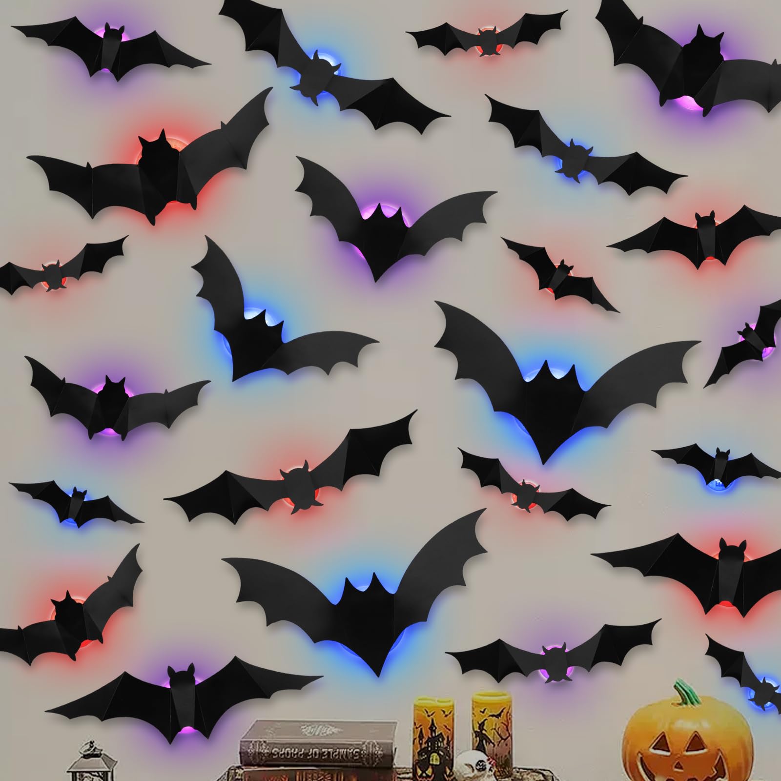 Lumières LED chauve-souris d'Halloween : le kit de chauve-souris LED d'Halloween comprend 24 autocollants muraux chauve-souris, 24 lumières LED et 24 autocollants double face. Dessin animé mignon personnage illustration vecteur chauve-souris... Alimentée par piles : chaque lumière LED est alimentée par 3 piles bouton et peut briller en continu. Expérience de décoration de bricolage : faire soi-même ces lumières chauve-souris avec votre famille est également une expérience très amusante. Décoration Halloween Lumières De Chauve-souris Violettes - 1.5m 10led - Guirlande Lumineuse Autocollants Chauves Souris Led 3d Violet Matériau de haute qualité : la lumière chauve-souris LED d'Halloween est fabriquée en PVC imperméable, solide et durable, adapté à une utilisation intérieure et extérieure, assurant un effet décoratif à long terme. Description du produit Caractéristiques du produit : Design 3D réaliste : chaque autocollant chauve-souris est équipé de lignes pliables, de sorte que les ailes peuvent être pliées à l'angle parfait, créant un effet de souris en cuir 3D vif et réaliste. Un nombre suffisant de lumières chauve-souris crée une forte atmosphère festive pour cet Halloween très attendu. Si vous souhaitez l'enlever, il est préférable de le chauffer d'abord avec un sèche-cheveux. Ensuite, vous pouvez facilement les retirer sans laisser de traces. Formes multiples : nous avons conçu 10 formes et tailles différentes de lumières chauve-souris que vous pouvez combiner et organiser librement selon vos propres préférences et besoins pour obtenir un effet décoratif unique. Poids : 280 g Occasions applicables : portes, salons, cuisines, escaliers, chambres, fenêtres, etc. Le kit de chauves-souris LED pour Halloween crée un look unique grâce à ses lumières violettes scintillantes, renforçant l'ambiance étrange. Fabriquées à partir de matériaux de haute qualité, ces décorations de chauves-souris sont durables et faciles à appliquer L'effet clignotant des lumières LED crée une atmosphère effrayante et effrayante pour vous. Plusieurs scènes : que ce soit une porte, un salon, une cuisine, un escalier, une chambre ou une fenêtre, vous pouvez décorer ces chauves-souris n'importe où dans votre maison pour créer une atmosphère effrayante d'Halloween. Décorations Chauve souris 3d Halloween Ensemble 12/24/36