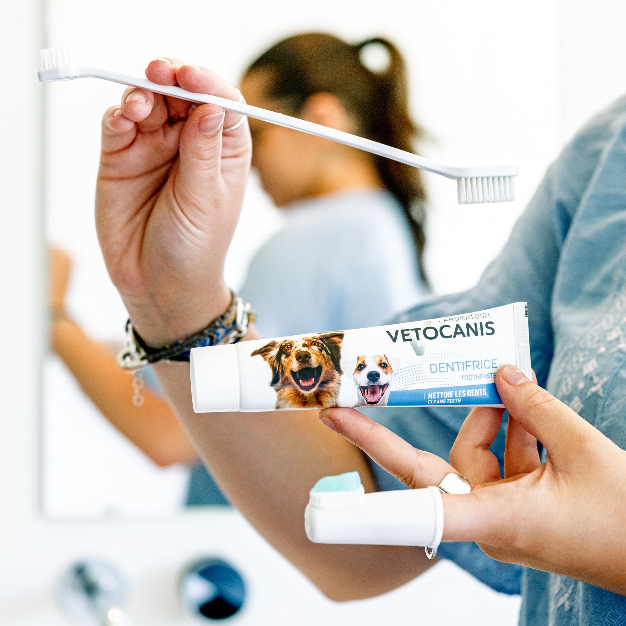 Dentifrice haleine fraîche pour Chien et Chat: Notre dentifrice est composé d’ingrédients naturels purs, qui peuvent nettoyer en profondeur la bouche des animaux de compagnie, éviter efficacement les problèmes bucco-dentaires courants et fournir un environnement buccal sain et frais pour les animaux de compagnie. Brosse à dents et dentifrice pour petits chiens dentifrice pour chiot... Et nos brosses à dents pour chiens sont conçues pour nettoyer efficacement les dents de votre animal tout en protégeant les gencives des égratignures et de la douleur. Attention: Pour maintenir la santé bucco-dentaire, il est recommandé d’utiliser un dentifrice pour chiens 2 à 3 fois par semaine. Brosse à Dents Double Tête Et Doigtier Pour Animaux Dentifrice Pour Chiot Chaton, Kit De Soins Dentaires Pour Chien Avec Dentifrice, Brosse à Dents Et Dentifrice Pour Petits Chiens, Pet Store Hospital Shelter Kit Soins Des Dents Kit Soins Dentaires Chien Chat Il élimine efficacement la saleté de surface des dents tout en réduisant l’accumulation de plaque dentaire. Spécifications: Nom du produit : Dentifrice pour chien contre le tartre Liste des produits : 95g Dentifrice pour chiens + Brosse à dents à double tête + Brosse à dents à doigt bleu + Brosse à dents à doigt blanc Caractéristiques: Le dentifrice pour chien aromatisé au bœuf augmente la volonté de votre animal d’accepter le nettoyage des dents et peut également aider à garder l’haleine fraîche de votre animal pendant le nettoyage. Notre dentifrice pour chien est fabriqué à partir d’ingrédients naturels et est exempt de produits chimiques nocifs. Soin Dentaire pour Chiens et Chats: Nous pensons que des dents saines et une bouche saine sont très importantes pour la santé globale de votre animal. Donnez à votre animal des dents et une bouche saines et propres pour une vie plus heureuse et plus saine ! Avec le set de dentifrice pour chien contre le tartre, vous obtenez un large éventail de résultats de nettoyage. Si nécessaire, il peut également être utilisé une fois par jour. Kit Dentifrice Brosse à Dents Le couvercle de la brosse à dents à doigts est fabriqué en matériau PP de haute qualité. Gel Dentifrice pour Chien et Chat Rafraîchit : L’ensemble contient 95 g de dentifrice pour chien aromatisé au bœuf, une brosse à dents à double tête, une brosse à dents à doigt bleu et une brosse à dents à doigt blanc. Dentidog - Dentifrice a pulvériser pour chien et chat