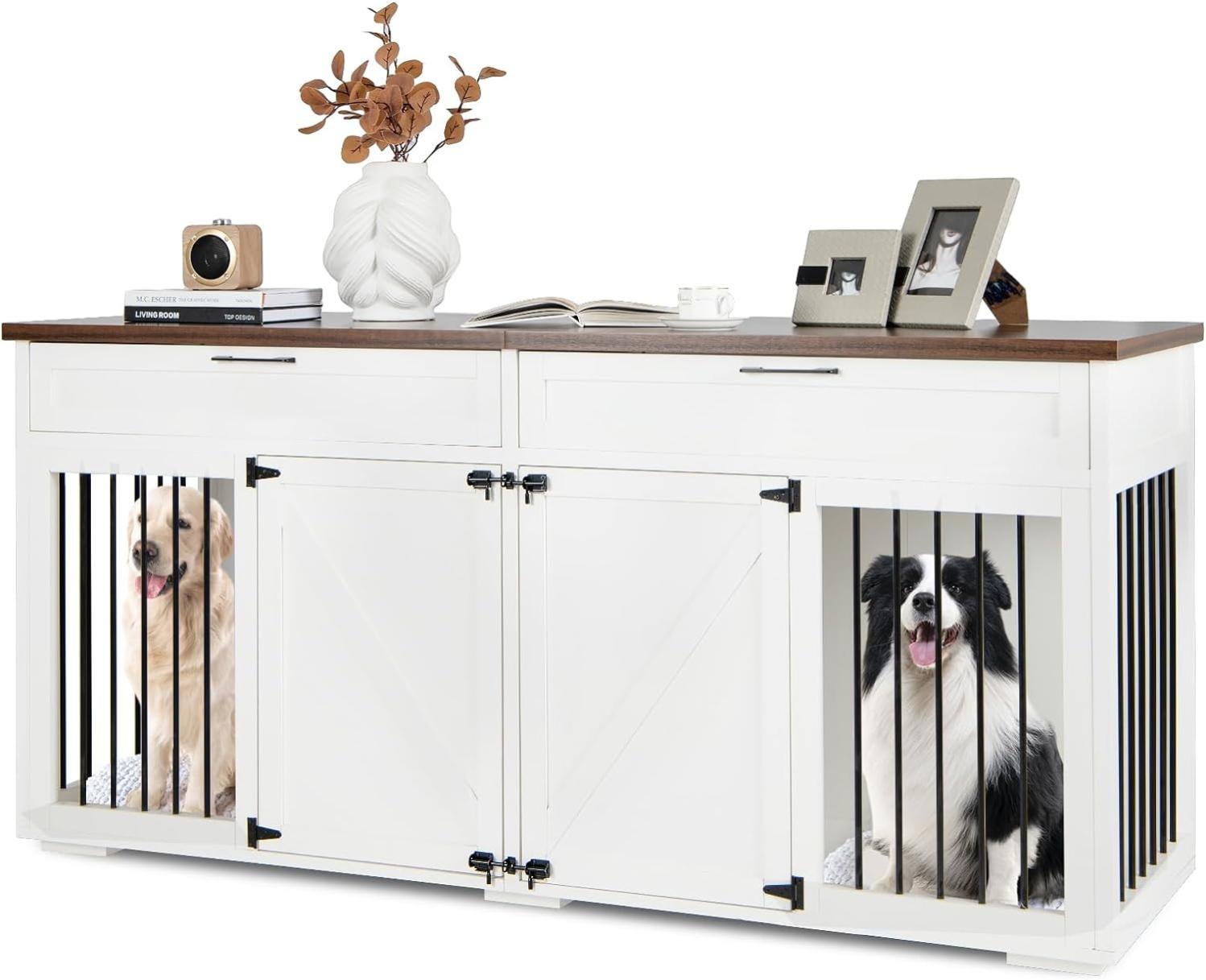 Pieds avec patins réglables : stabilité optimum. Niche Chien Intérieur Design PawHut Cage Pour Chien Meuble Cage Chien Intérieur Table D'appoint Niche Pour Chien Exterieur Pour vous offrir plus de praticité mais aussi pour répondre aux différents besoins des animaux. Sûr Nous utilisons des matériaux de qualité pour rendre la structure du produit stable et durable, non toxique, convient parfaitement pour vos animaux de compagnie. Convient à beaucoup d'animaux de compagnie Utilisation polyvalente avec une forte compatibilité. ACCÈS SÉCURISÉ, CONFORT : cage idéale pour garder votre chien en toute sécurité tout confort grâce à ses 2 portes verrouillables et à son coussin déhoussable inclus Cage pour chien PawHut meuble cage chien interieur table d porte verrouillable) et vous disposerez d'un nouvel espace de décoration et rangement grâce à son plateau aspect bois. aucun risque de rayure de votre sol , Montage facile. Cage très élégante tricolore noir aspect bois clair et blanc avec jolie mixité des matériaux (acier et aspect bois) : plus de raffinement par rapport à une cage classique en plastique et métal Refuge pour animaux de compagnie Véritable maison cosy et confortable pour vos amis à quatres pattes, offrez leur tout le confort dont ils ont besoin. CAGE POUR CHIEN DE TAILLE MOYENNE : cage dimensions 90L x 58l x 65H cm idéale pour les chiens de moyen gabarit (30 Kg max., ) Votre chien sera confortablement installé (cage grande taille, coussin en tissu oxford inclus, porte verrouillable) et vous disposerez d’un nouvel espace de décoration et rangement grâce à son plateau aspect bois PawHut Cage pour Chien Meuble Cage Chien intérieur Table d'appoint Multi-usages avec Double Porte et Coussin - Niche pour Chien Moyenne et Grande Taille - 90 x 58 x 65 cm, Aspect Gris : : AnimalerieCette superbe cage pour chien sur pied en acier noir et panneaux de particules aspect bois vous permettra de mêler l'utile à l'agréable ! Votre chien sera confortablement installé... Votre chien sera confortablement installé (cage grande taille. Grande cage confortable sur pied pour chien ou autre animal rapide grâce à la notice d'assemblage illustrée fournie Offrez à vos animaux de compagnies tout le confort et le bien-être qu’ils méritent.