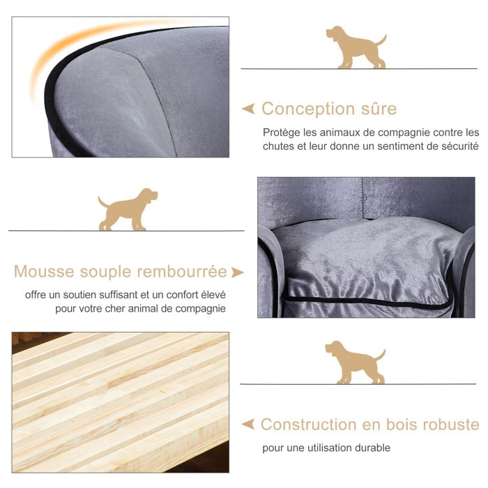 INFORMATIONS DU CANAPÉ POUR CHIEN : Dim. Meuble Animal Compagnie Confort Canapé Pour Chien - PawHut - Dossier Capitonné Au Toucher Velours Néerlandais - Housse De Coussin Lavable - Gris Panier Chien Dehoussable Lavable Package includes: 1 x Canapé pour Animaux 1 x Manuel d'Assemblage Offrez à votre animal le confort du canapé pour animaux PawHut ! Enveloppé dans un velours soyeux doux et soutenu par un cadre solide, ce sofa pour chien propose un espace de repos douillet avec un coussin pour une relaxation optimale Ce canapé pour animal de compagnie avec la surface en velours hollandais doux offre du confort Ce fauteuil pour chiens convient aux petits chiens jusqu'à 10 kg et 35 cm de longueur corporelle , Montage nécessaire PawHut Cage pour chien pliable en fil métallique avec plateau amovible... Sa structure robuste et son montage facile sans outil en font le choix parfait pour un coin reposant. Gâtez votre chien avec le canapé pour animal de compagnie PawHut, alliant élégance et confort. Particulièrement doux pour les pattes et le pelage, il assure un confort optimal tout au long de l'année Canapé pour chien marron 95x55x30 cm velours RG3Q30844 En velours néerlandais avec coussin lavable, il est idéal pour les petits chiens. Il suffit de visser les quatre pieds pour assembler le tout en moins de cinq minutes, une solution pratique pour les propriétaires d'animaux indépendants