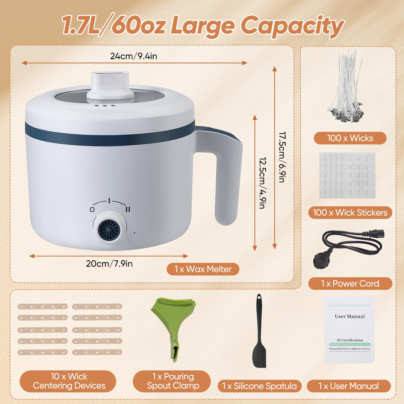 Fondeur de cire bougie - France 【Grande capacité et conception sécurisée】Notre fondoir cire bougie offre une capacité réelle de 1,8 litre (60 oz) et est plus sûr que les bains-marie traditionnels grâce à son design monobloc. Kit Fabrication Bougies Euakee Fondeur De Cire Bougie Electrique, 1.8L/60oz Électrique Fondeur Machine à Fondre Cire Bougie 1.8L 60oz Idéal pour des projets DIY créatifs ! Fondeur de cire électrique de 800 ml avec contrôle de température à 2 niveaux, poignée pliable, et kit complet pour fabrication de bougies DIY. Fondeur de cire pratique de 800 ml avec arrosoir, couvercle anti-poussière, thermomètre, cuillère à mélanger, mèches et supports Sa grande capacité de 1.8L (vraie capacité, pas d'arnaque sur la taille) vous permet de fondre assez de cire pour plusieurs bougies en une seule fois. Le bec... 【Le cadeau parfait pour les esprits créatifs】Vous cherchez un cadeau unique et pratique pour un hobby ? Notre kit bougies est une excellente idée pour vos proches. Vous pouvez le nettoyer facilement avec un chiffon alcoolisé ou de l'eau – les résidus tenaces appartiennent désormais au passé. Avec tous les accessoires inclus et un bec verseur facile à utiliser, il est idéal pour des soirées DIY détendues et stimule la créativité. Contrairement à d'autres kits, nous vous offrons plus d'accessoires, vous permettant de commencer immédiatement sans avoir à acheter de pièces supplémentaires. Gagnez du temps et concentrez-vous sur votre hobby créatif ! 【Découvrez le versement précis】Notre fondoir cire bougie électrique est équipé d'un bec verseur intégré, permettant un versement précis et sans gouttes de la cire.