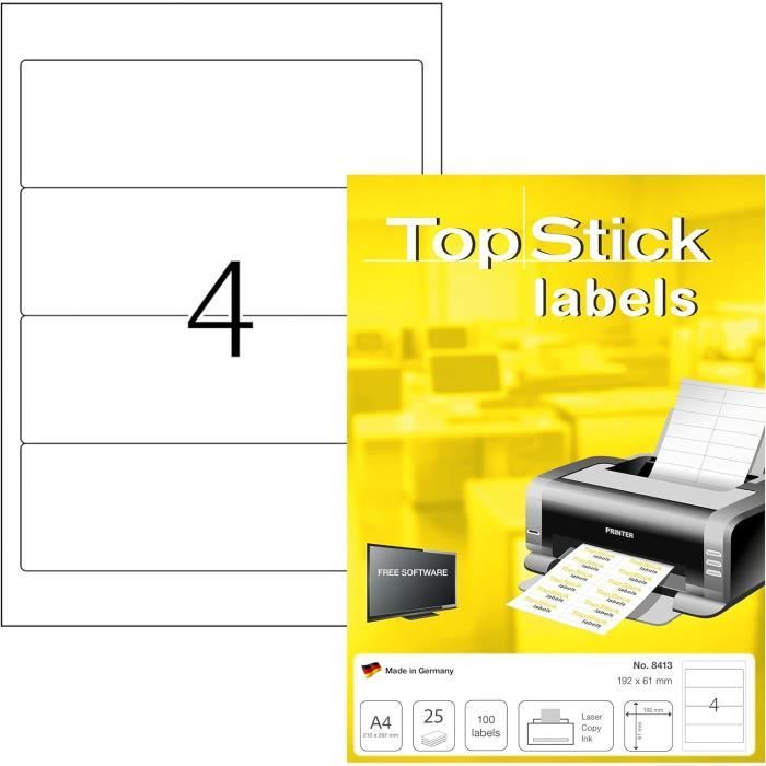 Contenu : 100 x Étiquettes de dos Leitz (56 x 190 mm), Imprimables PC pour classeurs à levier Leitz 1010, Gris, 16800085, L x H x P : 320 x 215 x 0,50 mm, 250 g étiquettes Classeurs L476010:Avery Zweckformft L4760-100 étiquettes Pour Classeurs à Levier Ft 192 X 38 Mm (lxh), 700 étiquettes Imprimables Classeurs Levier Leitz Description du produit Les étiquettes imprimables PC Leitz EasyPrint pour classeurs à levier larges sont la solution idéale pour organiser votre système de classement ! Etiquettes de dos imprimables PC pour une organisation rapide et facile des documents de travail Résultats optimals avec imprimantes jet d'encre et laser et photocopieuses Etiquettes en carton, larges et courtes pour une insertion facile dans les porte-étiquettes de dos Planche A4 microperforée pour une utilisation facile Convient à tous les classeurs à levier plastique référence 1010 1... La marque Leitz est synonyme de qualité, fonctionnalité et durabilité et ses produits sont conçus pour assurer votre efficacité tout au long de l'année. Grâce à un programme de recherche et de développement permanent, les produits Leitz sont constamment repensés et renouvelés pour vous offrir la meilleure performance qu'il soit. ESSELTE Classeur à levier plastique Standard A4 Dos 50 mm Bleu - Tout... Des produits de classement, des fournitures de bureau innovantes et de qualité supérieure pour le bureau et la maison. Fini les étiquettes avec inscriptions manuscrites, assurez-vous que vos documents sont bien rangés et ordonnés ! Points forts Feuille d'étiquette A4 au fort pouvoir couvrant et adhésif pour un rendu parfait après remplacement Étiquettes en carton de dos imprimables PC Leitz 1680 pour Easyprint est un service en ligne facile à utiliser pour élaborer et imprimer vos étiquettes confortablement et de façon individuelle., www., Leitz-easyprint., com. Résultat optimal avec imprimantes jet d'encre et laser et photocopieuses , Certifié Blue Angel
