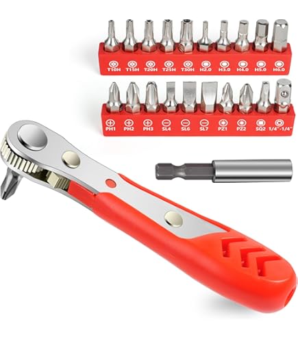 Convient pour les appareils ménagers, les meubles, l'automobile, l'utilisation industrielle, la réparation électronique, les jouets et l'artisanat, les projets de rénovation domiciliaire diy. Clé Cliquet Réversible 1/4 Avec 10 Embouts LAOA Mini Clés à Cliquet 1/4" Entraînement Couple Tournevis Cruciforme Clé Allen Les clés sont chromées pour éviter la rouille et les poignées en plastique PVC sont confortables. Clé à cliquet pour roue de pouce : taille compacte pour une utilisation pratique dans les espaces restreints, polyvalente pour la plupart des tâches de réparation, qui peut être utilisée pour réparer les motos, les voitures, les travaux mécaniques et l'assemblage de meubles Equipé d'un total de 10 petites embouts de tournevis à tête plate, tête cruciforme et tête torx, en acier allié s2, de haute dureté, résistant à l'usure et magnétique, facile à saisir et à fixer les vis. Ensemble de mini clé cliquet à vis, compact et portable pour une utilisation facile dans les espaces confinés et les coins tels que les coins en U, la surface arrière, etc. Sollbry 2Pcs Mini Clés à Cliquet,Tête Plate Tête Coude Tournevis à... Clé de tournevis à cliquet, la partie métallique est en acier au chrome vanadium, résistant à l'usure et durable, pas facile à rouiller, poignée en plastique PVC pour une prise confortable. Facile à utiliser: le système de cliquet commutable avec 36 dents en acier allié assure un cliquet en douceur et un réglage précis dans les deux sens; Une simple pression peut changer la rotation gauche - droite du tournevis, passer rapidement du serrage de la vis au desserrage. Clé à cliquet à angle droit pour système à cliquet réversible, assurant un réglage en douceur du cliquet bidirectionnel, actionné d'une seule main, basculant entre les rotations dans le sens horaire et antihoraire à l'aide d'un seul bouton pour serrer et desserrer les vis. Mesee Clé à cliquet 3 en 1 à cliquet de 6,35 mm - Clé à Liste d'emballage: 1 * Mini Clé à Cliquet 10 * Embout de Tournevis Court L'adaptateur d'embout de tournevis hexagonale 1/4 peut accepter n'importe quelle tête de tournevis hexagonale 1/4.