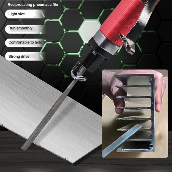 Outil Atelier Chanfreinage Coupe VBESTLIFE Cloueuse Pneumatique En Acier Allié Petite Machine à Clouer Lime Plate Ronde Triangulaire Meuleuse BGS Technic lime pneumatique a bande abrasive etroite de 10 x 330 - Bgs Technic Lime pneumatique - PWSHYMI - Scie à lime alternative - Acier allié - 10... Q: De quoi est fait le corps principal de la lime pneumatique ? A: Le corps principal de la lime pneumatique est en acier allié et est recouvert de caoutchouc antidérapant pour réduire les vibrations de meulage. Q: Quelles mesures de sécurité cet outil possède-t-il ? A: Cet outil possède un dispositif de sécurité intégré pour éviter les démarrages soudains. Q: Quels types de fichiers sont inclus avec cet outil ? A: Cet outil est équipé de limes triangulaires, rondes, plates et demi-rondes, ce qui le rend facile à remplacer et répond à divers besoins de traitement. Description du produit Q: Quels types de matériaux peut-on traiter avec cet outil ? A: Cet outil est adapté pour traiter divers matériaux différents, tels que la coupe, le chanfreinage, l'ébavurage, le moulage, l'estampage, la coupe, etc. UTILISATION LARGE : Convient au traitement de divers matériaux différents , tels que la coupe , le chanfreinage , l'ébavurage , le moulage , l'estampage , la coupe , etc . Sûr et silencieux : dispositif de sécurité intégré pour éviter les démarrages soudains , avec du coton insonorisant , peut réduire efficacement les vibrations et le bruit pendant le travail . 4 FICHIERS : Équipés de limes triangulaires , rondes , plates et demi rondes , faciles à remplacer et répondant à divers besoins de traitement . EJ.life lime pneumatique Lime de scie pneumatique, outil de coupe d'air...