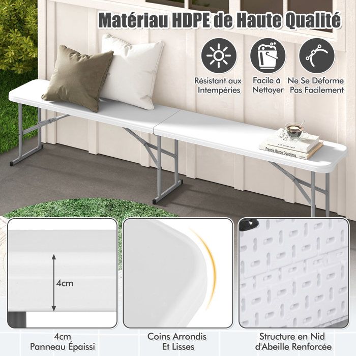 La construction légère et la poignée de transport le rendent facile à transporter et à déplacer partout où vous en avez besoin, offrant une praticité optimale. COSTWAY Banc de Jardin en Bois d'Hévéa Massif, Banquette d’Extérieur en... 【Application Multiples】Doté d'un dessus de banc imperméable, le banc pliable est adapté à l'extérieur. Capacité de charge : 300 kg. Banc HDPE Charge 300kg Banc Exterieur Jardin 182x27,5x43 Cm, Banc Pliable à 3 Places En HDPE Charge 300 Kg Cadre En Metal Coussinets Antiderapants 96602001 Banc Pliable HDPE 182 Cm Les pieds en métal avec revêtement en poudre avec structure en forme de ‘H’ offrent une expérience d'assise stable. Que vous ayez besoin d'un siège supplémentaire pour votre porche, en camping, sur une aire de jeux, il sera la solution parfaite. 【Durabilité et Stabilité】Fabriqué en HDPE, le dessus du banc est résistant aux fissures, à la décoloration et aux températures élevées, garantissant une utilisation prolongée et un entretien facile. Sa conception portable en fait un choix polyvalent pour les divertissements de jardin, tels que les barbecues, les fêtes, les pique-niques, ou certains autres événements sportifs. 【Détails Attentionnés】Chaque pied est livré avec un anneau verrouillable pour fixer le cadre pour une option d'assise sûre et robuste. La taille pliée est de 91 x 27,5 x 8 cm (L x l x H). 【Banc Pliable et Portable】Lorsque vous ne l'utilisez pas, vous pouvez simplement plier le banc exterieur en deux pour un rangement compact. COSTWAY Banc de Jardin Pliable en Bois d?Eucalyptus 2 Places... La dimension globale du banc de pique-nique d'extérieur est de 182 x 27,5 x 43 cm (L x l x H). De plus, le banc de jardin exterieur comporte de patins antidérapants, assurant une stabilité accrue et évitant les rayures sur les sols lorsqu'il est utilisé à l'intérieur. COSTWAY Banc Pliable de Jardin 180 cm en HDPE, Capacité de 600 kg, Siège Portable de Patio en Deux avec Poignée et Verrou, Marron - Jardin