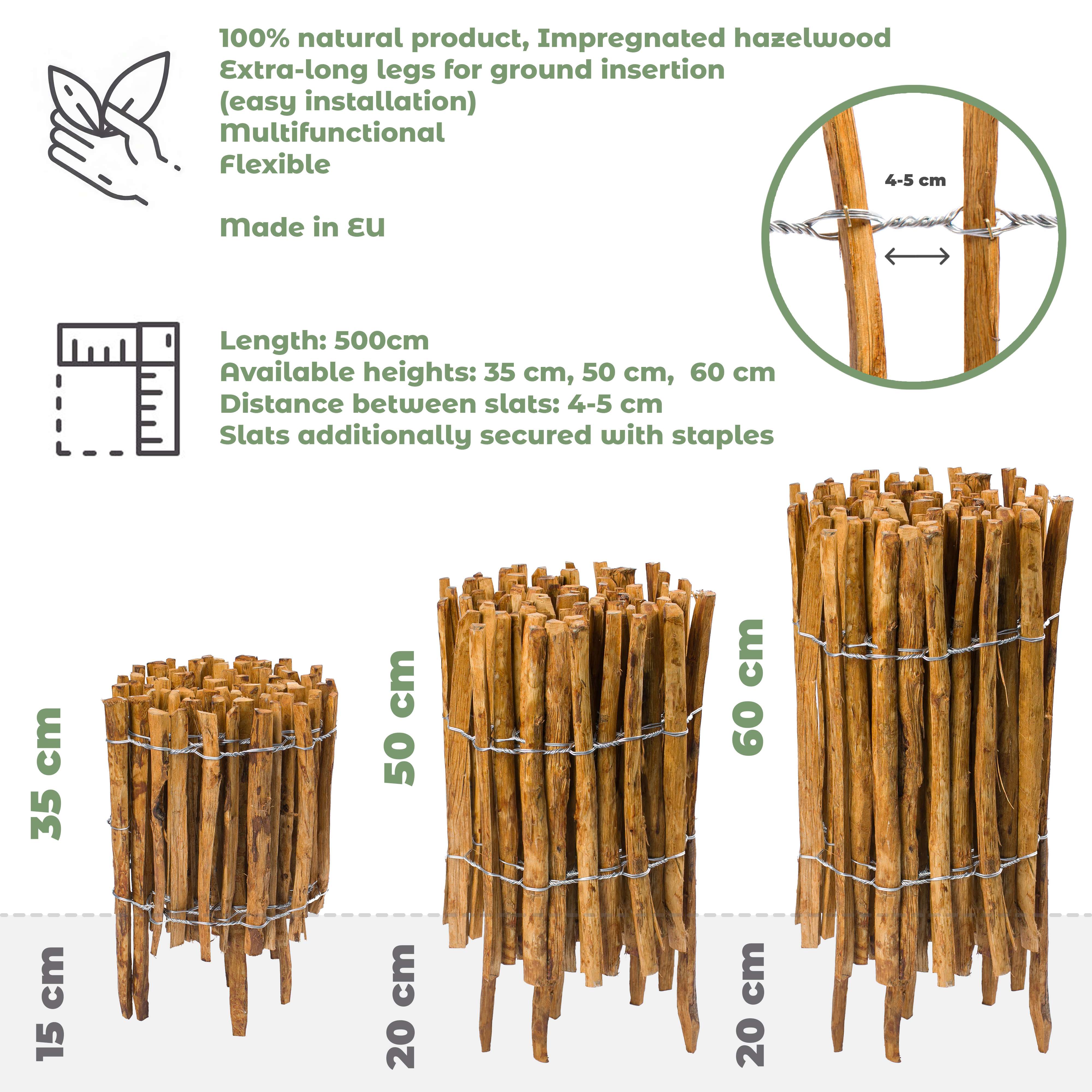 Créez votre clôture de rêve dès aujourd'hui avec notre kit de clôture en noisetier Contenu du kit : clôture en bois de noisetier : longueur par rouleau : 5 m. Vous cherchez une solution attrayante et durable pour délimiter votre jardin ou votre terrain ? Notre kit de clôture en noisetier est le choix idéal. La noisette est résistante à l'humidité et aux intempéries, ce qui garantit une longue durée de vie. Cloture En Panneau Rigide BOGATECO Clôture à Lattis Noisetier Bois | 60 Cm De Hauteur Et 500 Cm De Long | Distance Entre Lattes 4-5 CM | Idéal Comme Une Clôture De Jardin | Peut être Clôture Durable Montage Facile Montage facile : les piquets pointus et la structure de clôture flexible permettent un montage rapide. Variantes disponibles : nous proposons 14 variantes de kit différentes, adaptées à vos besoins (nombre de rouleaux de clôture de 5 m et de piquets). Montage rapide et facile : grâce aux piquets pointus et à la construction flexible de la clôture, le montage de la clôture est intuitif et ne nécessite aucun outil spécial ni aucune connaissance particulière. Options de hauteur variées : les hauteurs disponibles de 50 cm à 120 cm permettent une adaptation parfaite à vos besoins, d'une bordure de parterre basse à une protection visuelle plus élevée. BOGATECO Clôture à Lattis Noisetier Bois | 120 cm de | FindTheDeal Flexible, adaptable aux terrains accidentés. Assure la stabilité de la construction de la clôture. Deux variantes de style pour une vie privée : choisissez la clôture avec un espacement entre les lattes de 4 à 5 cm (plus d'intimité) ou 7 à 8 cm (aspect plus naturel) pour adapter le degré de délimitation exactement à vos préférences. Investissez dans un kit de clôture en noisetier pour la fonctionnalité, la beauté et l'harmonie avec la nature. Clôture en noisetier Hauteur 120 cm BOGATECO Piquet Clôture en Noisetier Bois | 500 cm de Long et 35 cm de... Piquets en noisetier : chaque piquet est pointu pour faciliter l'enfoncement. Choisissez la variante qui vous convient. Choisissez la distance de lattes souhaitée : 4-5 cm (plus d'intimité) 7-8 cm (équilibre esthétique et délimitation). Nous attachons une grande importance à la qualité et au naturel. Kit complet pour un montage facile : vous recevrez un paquet prêt à l'emploi avec une clôture en noisetier (5 m de longueur) et le nombre approprié de piquets pointus, y compris toutes les pinces nécessaires pour la fixation. Choisissez la hauteur souhaitée (clôture et piquets) : 50 cm, 60 cm, 70 cm, 80 cm, 90 cm, 100 cm, 120 cm.