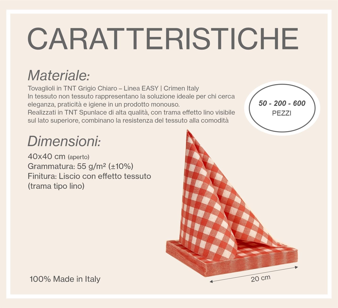 Serviette non-tissé 40x40cm imitation tissu à petit prix Serviettes Absorbantes Similaires Tissu Serviette TNT Jetable 40 X 40 Cm En Tissu Non Tissé Rouge Carreaux | 50 Pièces | Résistante|absorbante | Similaire Au Tissu | Idéale Pour La Restauration | Biodégradable Serviettes Effet Lin Pour Restaurant Vaisselle compostable, vaisselle biodégradable et Assiette biodégradable à retrouver au meilleur prix sur notre boutique. Livraison rapide 1 Ligne EASY 2 Nuances 3 Multipacks Dimensions parfaites pour toutes les tailles en place – Format 40 x 40 cm, idéal pour les restaurants, la restauration, la banquetage, les cérémonies et les... EMBALLAGE POLYVALENT – Disponibles en boîtes pratiques de 50, 200 ou 600 pièces, adaptées aussi bien pour les petites consommations que pour les grands volumes typiques de restaurants et services de banqueting. Qualité supérieure fabriquée en Italie – Fabriqués entièrement en Italie avec de la cellulose de qualité et une finition effet lin, ils sont doux au toucher, résistants à la déchirure et très absorbants, assurant confort et fonctionnalité.