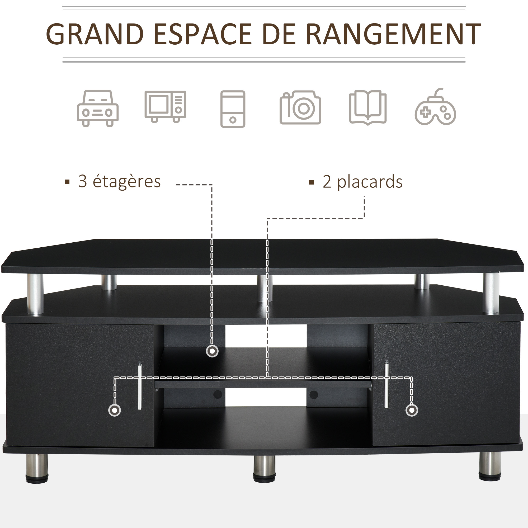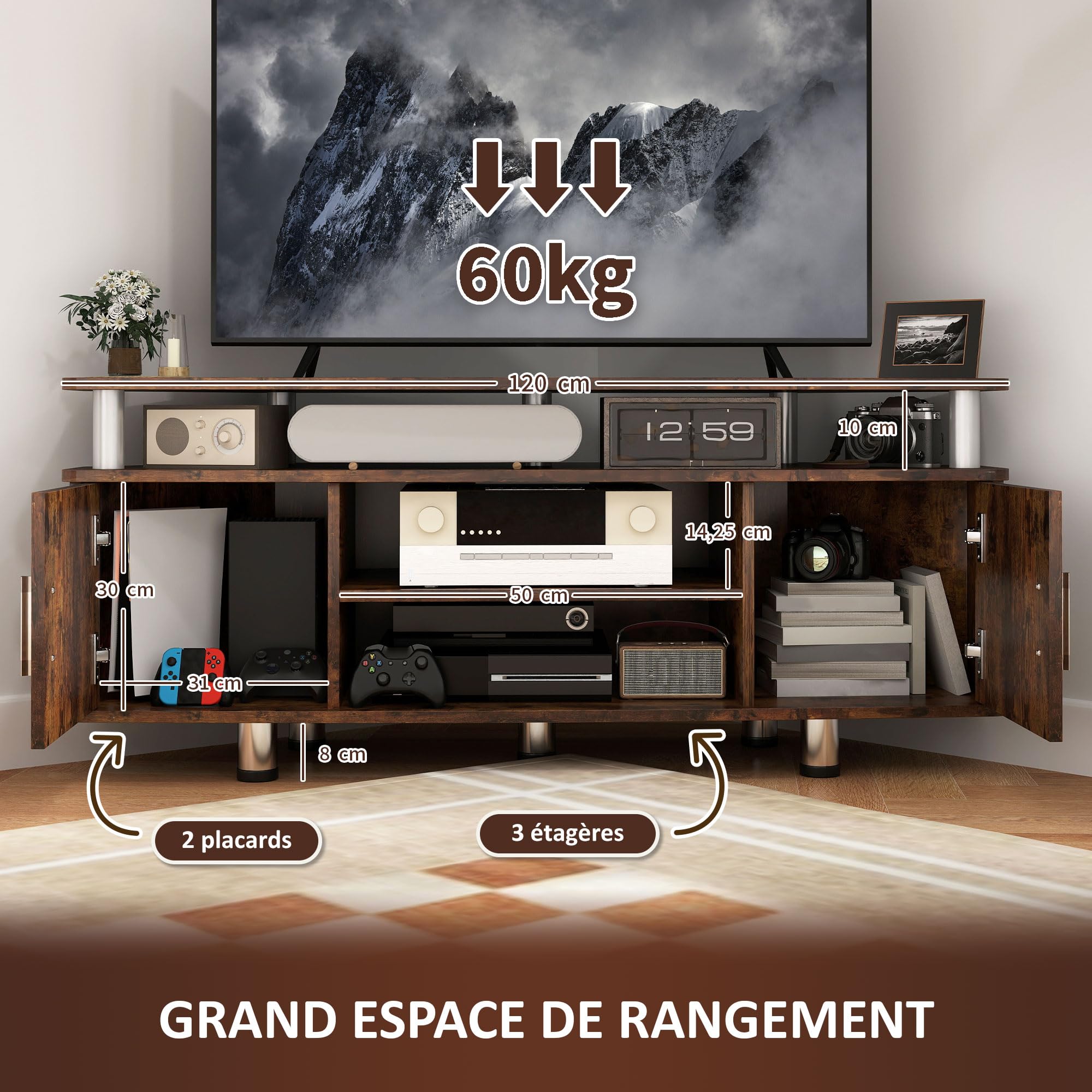 Meuble Tv Avec Rangement Meuble Tv 120 Cm, Pour Téléviseur Jusqu'à 55 Pouces Avec 4 Portes, Plateau Effet Marbre, étagères Réglables Et Pieds En Acier Support TV 55 Pouces BALI - Meuble TV 120 cm en bois noir et cannage Meuble Tv Meliconi Rouge 80x62x117cm Saho - Meuble Tv 120 Cm Terracotta Avec Porte Abattante En Équipé de 4 repose-pieds réglables en bas pour maintenir le meuble si surface non stable LIV - meuble TV 120 cm gris clair avec porte abattante en textile acoustique et infrarouge... recommandée : 44 kg (au total), 3 kg (par tiroir), 20 kg (plateau), 15 kg (étagère) ADAPTABILITÉ : Ce meuble pour télévision peut supporter jusqu'à 44 kg et convient aux télévisions de 55 pouces max. Elle convient parfaitement au salon et à la chambre. GRAND ESPACE DE RANGEMENT : Ce meuble TV dispose de trois tiroirs pliables et d'une étagère qui a suffisamment d'espace pour ranger vos magazines, DVD, télécommandes etc