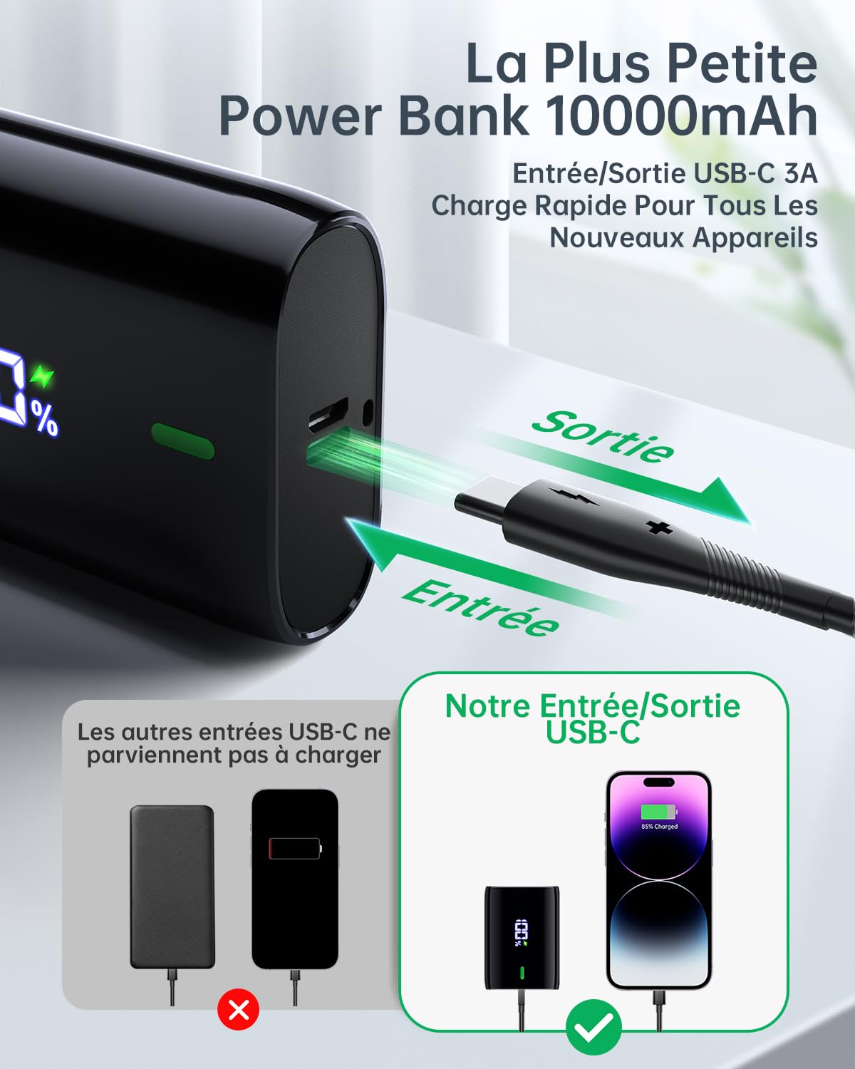 Power Bank Compact IPhone Android Coblob Batterie Externe, 30W 27000mAh Power Bank, Batterie Portable USB Batterie Externe 10000mAh L'avantage de 3 Sorties et 2 Entrées : Le nouveau Coolreall batterie externe dispose de deux sorties USB-A (5V/2,4A), d'une entrée/sortie USB-C (5V/3A) et d'un port Micro USB (5V/2A). Avec le bon câble, vous pouvez recharger vos appareils électroniques et les partager à tout moment et en tout lieu avec vos amis et votre famille Baseus Power Bank 15W 10000mAh Qpow Batterie Externe avec câble de Type Il est compatible avec la plupart des appareils électroniques disponibles sur le marché et même les petits appareils tels que les Haut - parleurs Bluetooth et les montres intelligentes s'adaptent parfaitement. Wonder Full Power - Batterie Externe 10 000 mAh - Power Bank -1 Port USB-A & 1 Port USB-C - Power Delivery 20W - Compatible avec iPhone, Samsung, Huawei, Xiaomi... 【Écran LED et conception de sécurité】 cette mini batterie externe legere est équipée d'un écran LED qui vous permet de suivre les informations exactes de la batterie à tout moment. 【Charge rapide 3A】 Cette chargeur externe prend en charge la charge rapide 3a, la vitesse de charge rapide 3A est deux fois supérieure à celle du chargeur portable 2a, vous permettant de dire adieu à l'expérience de charge longue attente, pas besoin de vous soucier de votre téléphone sans charge, économisez plus de temps. 【Large compatibilité】 Équipé d'une interface de type - C nouvellement mise à niveau qui prend en charge les entrées / sorties, plus une interface de sortie usb - A qui peut répondre à la charge simultanée de deux appareils en même temps, peut être partagé avec la famille et les amis sans attendre pour charger. 【 Taille mini et performances puissantes】 Ce batterie externe avec des dimensions de seulement 8,1x5,5x2,6cm et un poids de seulement 175g, est 30% plus petit que les autres power bank disponibles sur le marché et peut facilement se glisser dans n'importe quelle poche ou sac.