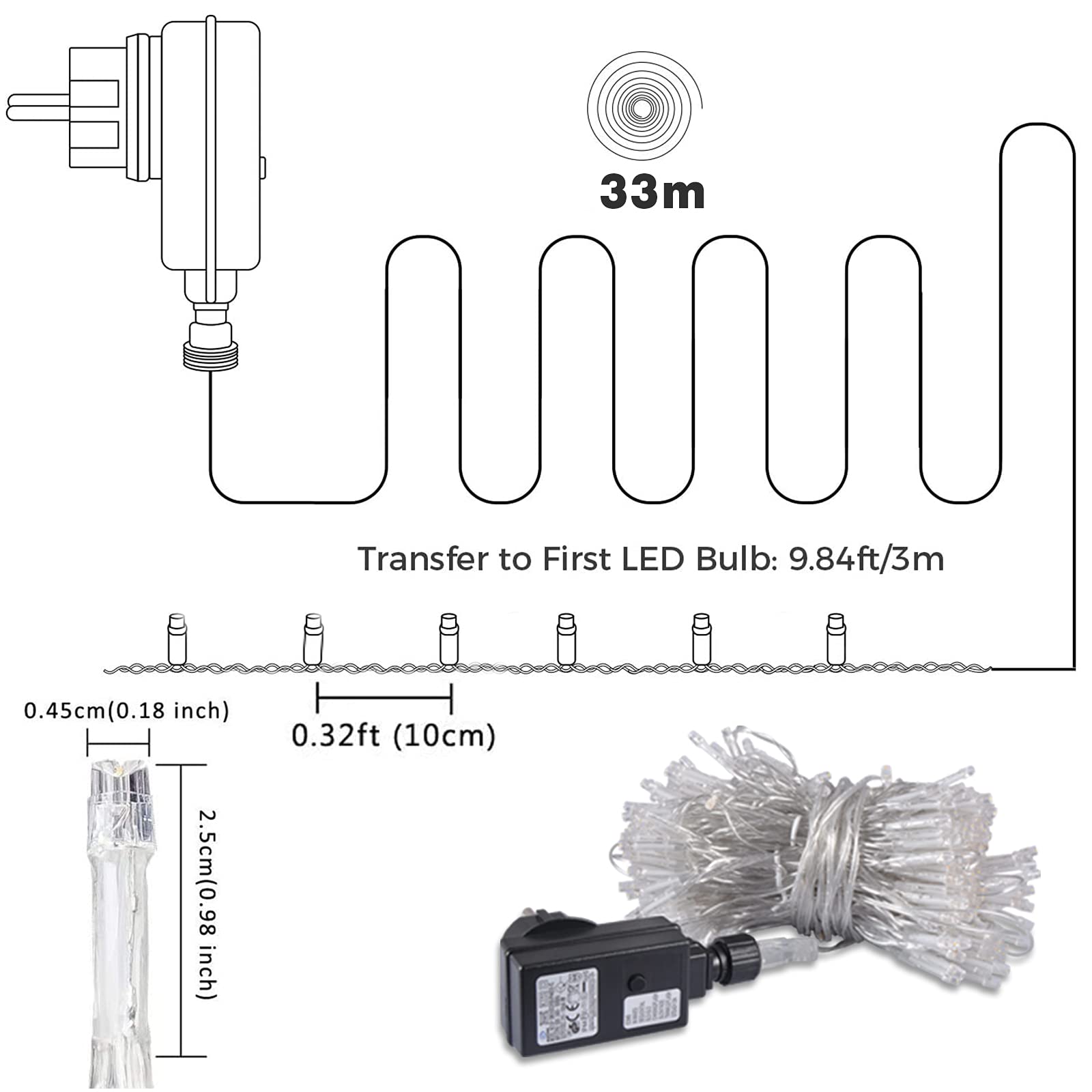 Décorez le sapin de Noël avec votre famille. La guirlande ne consomme que 6W. Modes De Guirlande Lumineuse De 9,8 × 9,8 Pieds, Étanche, Prise Usb, Lumières En Fil De Cuivre Pour Fenêtre De Chambre À Coucher, Fête De riage De Noël... Si vous l'utilisez à l'extérieur, veuillez effectuer la protection imperméable nécessaire. Et grâce au câble d'approvisionnement de 3 mètres, vous pouvez les installer n'importe où vous souhaitez. Sûreté Cette guirlande est sûre, même les enfants peuvent la toucher, mais il faut être sous la surveillance et la protection d'un adulte. Description du produit Profitez-vous de cette guirlande LED pour créer une ambiance romantique et charmante. Spécifications : Longueur : 13/23/33M (longueur totale) Décoration Lumineuse Noël Guirlande Lumineuse Led Colorée,Eclairange Intérieur Avec 300 Led-33M-8 Guirlande 300 LEDs 8 Modes ⭐Utilisation Simple -- Les fils de cuivre sont flexibles. Économie d'énergie -- Les guirlandes sont en 30M avec 300 LEDs. Il existe également une ligne d'approvisionnement 3M. La guirlande ne consomme que 6W. ⭐8... Créer une atmosphère festive Parfait pour la décoration intérieure et extérieure de multiples occasions. Il existe également une ligne d’approvisionnement 3M. Choisissez vos modes préférés. Guirlande Lumineuse Led Bleue - Fonctionne Avec Pile - 300 Led 24M - 8 ⭐La Fonction de Mémoire -- Les guirlandes lumineuses peuvent sauvegarder le dernier modèle sélectionné. 3 Tailles à votre choix : 13 mètres, 23 mètres, 33 mètres. Fonction de mémoire Fonction de mémoire vous permet d'allumer les lumières de l'arbre de Noël en appuyant sur le bouton et de rester dans le mode préféré réglé la dernière fois. Pendant les fêtes de fin d'année, les lumières de Noël extérieures créent une atmosphère gaie et romantique pour votre sapin de Noël, votre chambre, votre terrasse, votre jardin, vos escaliers, et votre mariage. La barrière immatérielle vous offre un éclat séduisant pour créer une bonne atmosphère. Conditions de travail : -10° ~ 40 Tension de fonctionnement : 31V, Puissance : 6W Étanche IP44 Idéal pour la décoration intérieure et extérieure. Les lumières blanches froides garantissent une luminosité agréable et non-éblouissante. Vous pouvez plier les guirlandes en différentes formes selon vos souhaits.