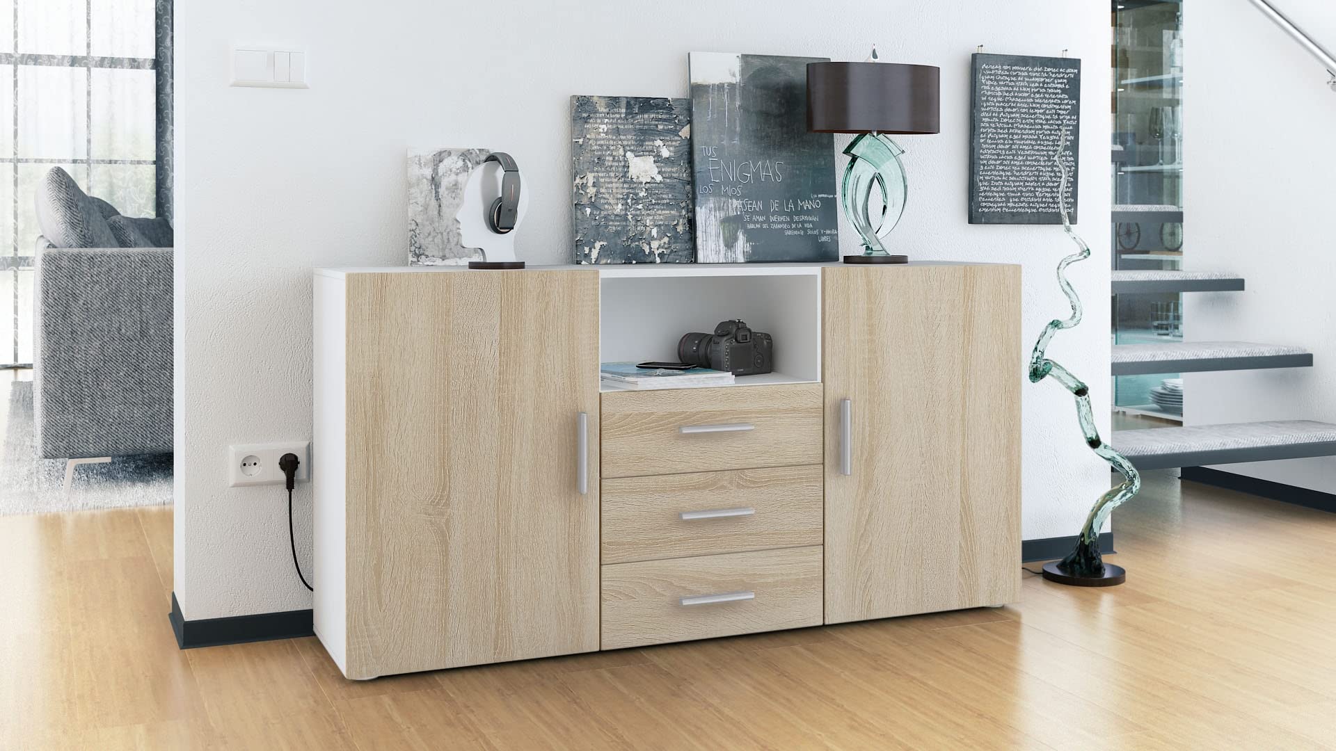 Disponible dans de multiples coloris pour un maximum de choix. Les deux portes situées à droite et à gauche s’ouvrent chacune sur un vaste compartiment avec une tablette amovible. Entre ces deux portes, on trouve également trois tiroirs pratiques surmontés d’un compartiment ouvert. Les tiroirs s’ouvrent silencieusement et sont faciles à manier. La commode comprend un panneau arrière de fibres dur aspect bois. Il est équipé de deux grandes portes, d'un compartiment ouvert et de trois tiroirs coulissants sur des rails métalliques pour une utilisation silencieuse et fluide. Grâce au système innovant push-to-open, les tiroirs et les portes s'ouvrent facilement avec une simple pression Finition de qualité - Made in Germany. Façades modernes avec poignées discrètes Pour souligner le design épuré du buffet, celui-ci a été pourvu d’élégantes poignées argent. Commode Skadu disponible dans de nombreux coloris La commode Skadu est un meuble de rangement idéal qui convient à toutes les pièces. Meuble Chaussure Vladon Buffet Skadu, Commode Avec 2 Portes, 3 Tiroirs Et 1 Compartiment Ouvert, Blanc Mat/chêne Brut (138,5 X 71,5 X 35 Cm) : Vladon Meuble Rangement 2 Portes 3 Tiroirs Skadu v4 buffet, commode avec 2 portes, 3 tiroirs et 1 compartiment... Vous pouvez également choisir un autre coloris parmi les nombreuses versions disponibles. tablettes : 15 kg, Charge max. Dimensions commode Skadu Dimensions de la commode (LxHxP) : 138,5 x 71,5 x 35 cm Compartiment ouvert (LxHxP) : 45 x 20,5 x 31,5 cm Intérieur tiroir (LxHxP) : 41,5 x 7,5 x 29,5 cm, Portes (HxP) : 70 x 46 cm Poids total de la commode : 37 kg, Charge max. Montage simple et rapide garanti ! Commode 2 Portes Et 3 Tiroirs, 120 X 40 X 76 Cm En Chêne Foncé - Buffet Ouverture : Avec des portes et des poignées discrètes soulignant son design moderne, la commode possèdent des rails télescopiques en métal permettant d'ouvrir et de fermer les tiroirs silencieusement et confortablement. Surface en matériau facile d’entretien Les matériaux de finition haut de gamme et le revêtement de surface des façades et du caisson rendent la commode légère, résistante et très facile d’entretien. Le nettoyage ne nécessite aucun produit chimique : il suffit d’utiliser un chiffon légèrement humide pour nettoyer la surface résistante à l’eau du buffet. Grâce à des matériaux de finition haut de gamme, le buffet est à la fois léger et résistant - Fabriqué en Allemagne.