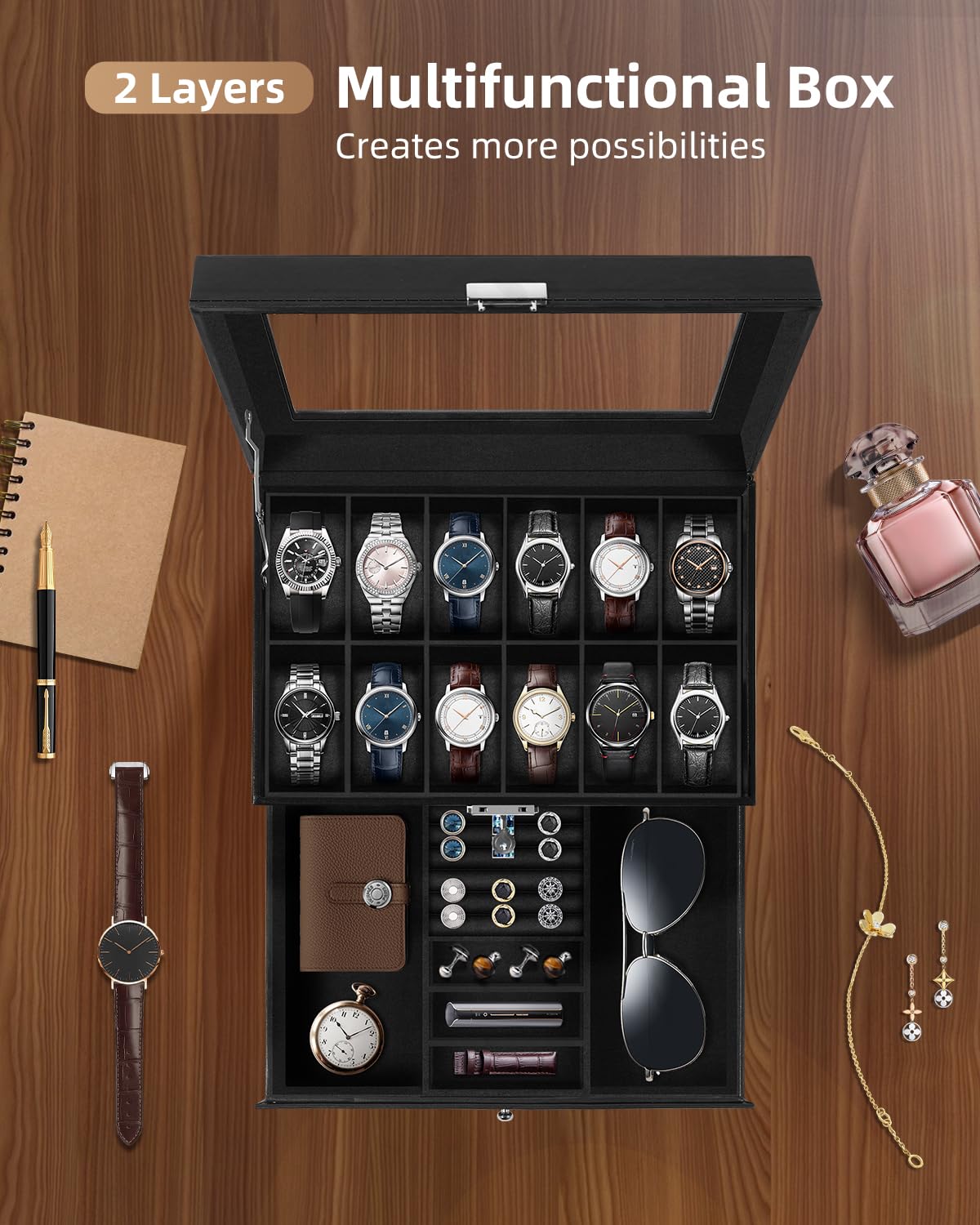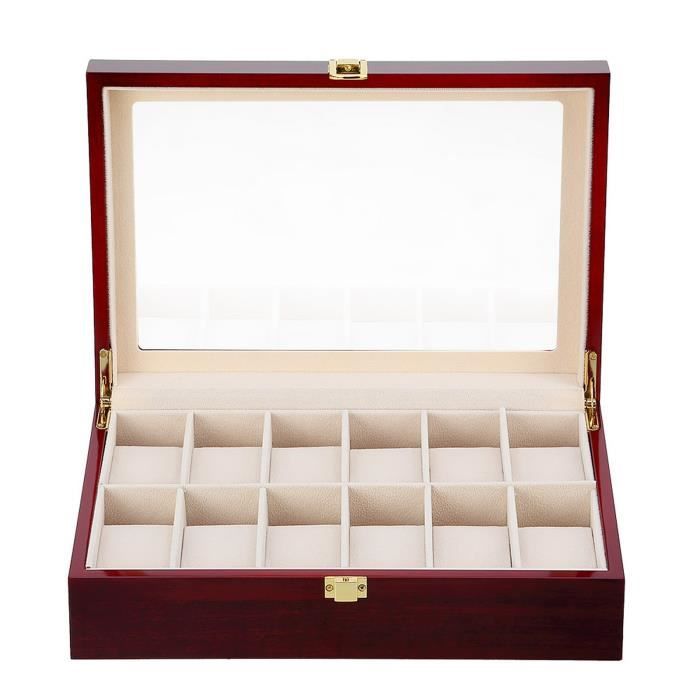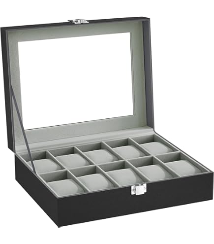 SONGMICS PRÉSENTOIR, COFFRET, Boîte à Montres, 5 Compartiments, Cadeau... 【Conception à Compartiments】 Le compartiment à montres à 10 compartiments, élargi et approfondi, offre un espace de rangement suffisant pour différents types de montres dont le diamètre du cadran est inférieur à 52 mm. 【Boucle de Sécurité】 La boucle métallique rétro rend le coffret à montres plus élégant, solide et antirouille, facile à ouvrir et à fermer, et peut être utilisé d'une seule main Boîte à Montres Bois Boîte à Montres Avec 12 Compartiments,Écrin à Montres,Vitrine De Montres,Boîte De Rangement Pour Rangement Montre Organisé Bois l'intérieur est en velours fin et doté d'un coussin en soie coton, offrant un bon maintien et protégeant la montre des rayures Coffret pour montres avec placage style fibre de carbone - 10... 【Robuste et Durable】 Le cadre extérieur du coffret à montres est en bois de paulownia de haute qualité, sans peinture et sans odeur, préservant ainsi sa texture naturelle. Boîte à Montres En Bois Pour 10 Montres- Boîte à Bijoux - Organisateur De Rangement Avec Couvercle En Verre Boite De Rangement Cadeau Pour Homme Et Femme 81949032