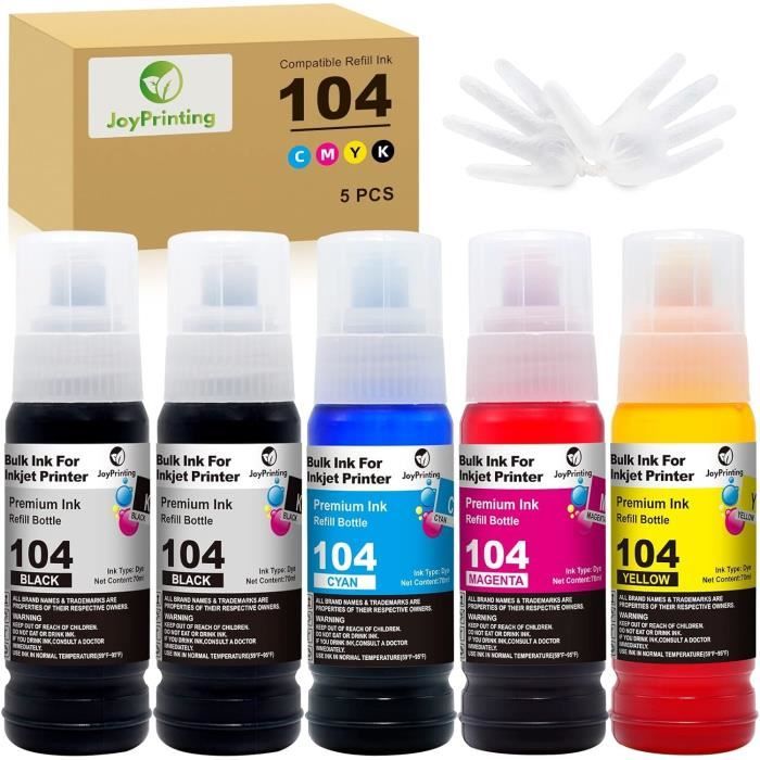 Emballage Emballage intérieur du produit: Sac plastique noir Emballage: Boîte neutre Boîte individuelle Quantité: 1 x Noir, 1 x Cyan, 1 x Magenta,1 x Jaune. Pack Bouteilles EPSON 104 / C13T00P640 noir et couleur - bouteille d'encre de marque EPSON 【Respectueux de l'environnement】 En choisissant nos bouteilles d'encre compatibles, vous faites un choix écologiquement conscient. Bouteille Encre Pour ET-2820 ET-4800 ET-2870 UniPlus Encre E104 ET-2870 ET-2812 ET-2821 ET-1810 Compatible Pour Epson E104 Multipack Couleur Bouteille Cartouche Compatible Pour Epson Ecotank ET-2820 ET-4800 ET-2810 ET-4810 ET-2826 ET-2720 2840 Encre Compatible E104 Rendement d'impression : Haut rendement, environ 4500 pages pour Noir (70 ml), environ 7500 pages pour Cyan Magenta Jaune (70 ml) à 5% de couverture, papier A4, lettre., (Norme ISO/CEI). Bien que l'emballage soit différent, le produit est le même et cela n'a aucun effet sur l'utilisation du produit. Supply Guy Encre Copatible avec Epson 104 pour ET-2710 ET-2711 ET-2712... Profitez d'une excellente qualité d'impression tout en contribuant à un avenir plus vert. Couleur et Code: Noir Code: C13T00P140; Cyan Code: C13T00P240; Magenta Code: C13T00P340; Jaune Code: C13T00P440., 【Qualité d'impression supérieure】 Faites confiance à nos bouteilles d'encre compatibles pour fournir des performances constamment fiables. Tinte 104 ultipack kopatibel für Epson 104 Tinte ET-2820 ET-4800 ET... 【Rendement d'impression & Code】 Haut rendement, environ 4500 pages pour Noir (70 ml), environ 7500 pages pour Cyan Magenta Jaune (70 ml) à 5% de couverture, papier A4, lettre., (Norme ISO/CEI). Veuillez l'utiliser en toute confiance. Avec une technologie avancée et des composants de haute qualité, nos bouteilles d'encre offrent des résultats cohérents et fiables throughout toute leur durée de vie. Compatible pour imprimantes: Compatible pour ET-1810 ET-2711 ET-2712 ET-2714 ET-2715; ET-2720 ET-2721 ET-2726; ET-2810 ET-2811 ET-2812 ET-2814 ET-2815; ET-2820 ET-2821 ET-2825 ET-2826 ET-2830 ET-2840 ; ET-2860 ET-2861 ET-2862 ET-2864 ET-2865; ET-2870 ET-2876 ET-4700 ET-4800 ET-4810 Imprimantes. Nos bouteilles d'encre sont fabriquées avec des matériaux écologiques, réduisant les déchets et minimisant l'impact sur l'environnement.