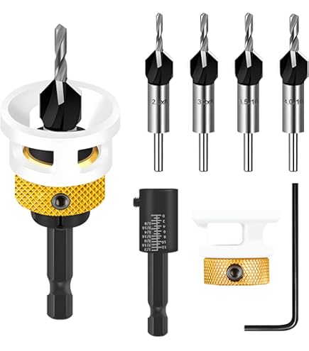 Pince à rodage ROTILABO® pour rodages coniques Avec vis d'arrêt, 29/32 Profondeur de perçage réglable : le trou de guidage et la profondeur de fraisage peuvent être ajustés avec précision - Idéal pour tous ceux qui veulent obtenir des résultats propres et réguliers avec une perceuse à fraise. Foret Bois Forets Avec Butée Profondeur Lot De 6 Forets Coniques à Bois - Tige Hexagonale 1/4" - HSS-M2 - Avec Butée Profondeur - Pour Travail Du Bois Outil Menuiserie Précision Fraises à Bois Coniques Avec Butée La tige hexagonale assure un maintien sûr et est compatible avec la plupart des perceuses courantes. Que ce soit pour la construction de meubles, les travaux d'atelier ou les projets de bricolage, ce kit de forets coniques est un outil fiable pour un fraisage propre dans une grande variété de matériaux en bois Lot de 6 forets coniques à bois avec butée de profondeur... Cet ensemble de 12 pièces contient 6 forets coniques de taille #8 (11/64 pouce) et 6 forets coniques de taille #10 (3/16 pouce), complets avec 2 clés Allen et 2 pinces d'arrêt de profondeur. Les forets coniques sont fabriqués en acier HSS M2 de haute qualité, connu pour sa ténacité et sa résistance à l'usure élevées, ce qui les rend parfaits pour le bois dur comme le bois tendre... Large gamme d'applications : le foret à bois avec fraise convient aux perceuses à main, aux forets d'établi et aux visseuses sans fil. Facile à utiliser : la tige hexagonale de 1/4 permet un changement de foret rapide, adapté à toutes les machines courantes. Il peut être utilisé sur du bois massif, du contreplaqué, du MDF, des panneaux de particules, des plaques de plâtre ou des panneaux en plastique. Avec la clé Allen fournie, le foret et la butée de profondeur peuvent être ajustés individuellement. La clé Allen permet de régler facilement la profondeur - Idéal pour les applications flexibles avec différents forets à bois avec fraiseuse. YushengTai Lot de 6 forets coniques