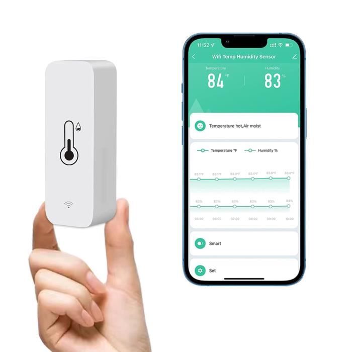 Alertes de température et d'humidité Prise en charge de l'exportation des données Thermomètre Connecté, WiFi Hygrometre Interieur Thermomètre Extérieur, Portée de 150m, Exportation de Données et étalonnage Gratuits, 1 Capteur : : Commerce, Industrie et ScienceDemandez le retour d'un produit jusqu'à 14 jours après sa réception, sans motif, pour obtenir un remboursement complet (prix et frais de livraison) au titre du droit légal de rétractation... Nombre maximal de connexions : 10 Application Smart Life : prend en charge les notifications d'alerte, la consultation des données à distance, l'enregistrement et l'exportation des données vers des fichiers . L'unité principale peut se connecter à un maximum de 10 capteurs externes. Prise en charge de l'intégration des appareils intelligents, Compatible avec Alexa Dans l'application, vous pouvez surveiller simultanément les données de température et d'humidité dans plusieurs environnements tels que les chambres, les serres, les garages, les pièces pour animaux et les salles de bains. Connectez-vous à l'unité principale via une application mobile pour consulter les données à distance. Thermomètre Intérieur Station Météo Professionnelle Froggit WH3000 SE - WiFi Connectée - Capteur Extérieur 6-en-1 - Application Mobile Station Météo Professionnelle Application Kit Wi-Fi pour la mesure de la température et de l'humidité Caractéristiques techniques : Protocole sans fil : Wi-Fi 2,4 GHz, RF 433 MHz Sélectionnez la valeur de calibrage, puis appuyez une fois sur le bouton de réinitialisation. Prise en charge de l'affichage des données quotidiennes, mensuelles et annuelles Idéal pour surveiller les grandes maisons ou les résidences à plusieurs étages. Si la température ou l'humidité réelle dépasse ces limites, l'application enverra immédiatement un message de notification. IP65 étanche Le capteur externe est étanche à la pluie et à l'eau. Étalonnage du thermomètre et de l'hygromètre Les capteurs extérieurs offrent une autonomie pouvant atteindre 12 mois. Il ne convient toutefois pas à une immersion prolongée dans l'eau. Précision : ±0,5 °C, ±5 % HR La précision de l'humidité atteint ±5 % dans la plage d'humidité relative de 0 à 100 %. La transmission du signal RF-433 MHz est stable et prend en charge une distance de connexion maximale de 150 mètres (en espace ouvert). Capteur Température Humidité Thermomètre Connecté Wifi Intérieur | Thermomètres & Sondes Thermomètre Intérieur Alertes de température et d'humidité Vous pouvez prédéfinir les plages acceptables pour la température et l'humidité sur la page des alertes. Haute précision : le kit de mesure de la température et de l'humidité Chatten offre une plage de mesure de la température de -20 à 60 °C avec une précision de ±0,5 °C. L'application prend en charge l'étalonnage des données. Statistiques de température et d'humidité Compilation des données horaires Enregistrement et exportation des données Résumé des valeurs maximales/minimales et moyennes Surveillance multi-environnements : le capteur intérieur prend en charge la connexion de jusqu'à 10 capteurs extérieurs. Plage d'humidité : 0 à 99 % HR Tuya Thermomètre Hygromètre Intelligent Wifi Avec Horloge Et Affichage... Mode d'emploi en anglais Surveillance intérieure/extérieure : l'unité principale intérieure se connecte au sous-capteur extérieur via des signaux RF 433 MHz, maintenant une communication stable jusqu'à 150 mètres. Alimentation électrique : le capteur intérieur doit être connecté à une source d'alimentation.