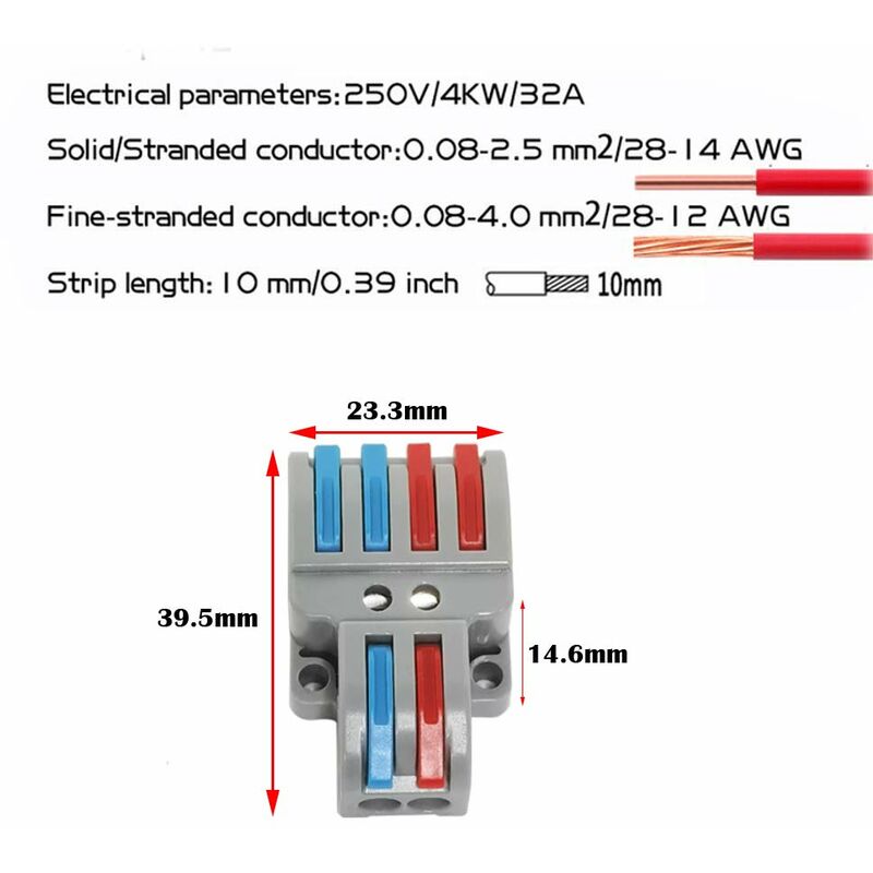 ✔️ Câblage simplifié 2 entrées 4 sorties : Simplifiez les connexions grâce à ces borniers à levier intuitifs 2 entrées 4 sorties. Bornier De Connexion YOSOO Connecteur à Levier Connecteur D'épissure De Fil, Connecteur De Fil à Levier, Connecteur Bloc Connexion Fils Solides Souples Idéal pour les bricoleurs, les particuliers et les techniciens. ✔️Conception robuste et sécurisée : Boîtier en PA66 ignifuge de qualité supérieure pour une sécurité optimale, ressorts en acier inoxydable résistants pour une force de serrage durable et contacts en cuivre violet haute conductivité pour un flux de courant optimal. ✔️ Large compatibilité de fils : Convient à divers types de fils : fils pleins de 0,08 à 4 mm² (28 à 12 AWG) et fils flexibles de 0,08 à 2,5 mm² (28 à 14 AWG). ✔️Contenu de l'emballage : Le paquet contient 9 borniers 2 entrées et 4 sorties, 18 supports pour le montage sur rail DIN et un jeu de vis de montage. CEN Connecteur de câblage poussoir 20pcs connecteur de câblage de fil de poussée borniers Scénarios d'utilisation : La configuration 2 entrées-4 sorties est idéale pour une distribution de circuit simple. Raccordez efficacement deux lignes d'entrée à quatre lignes de sortie, permettant une épissure rapide, sécurisée et sans outil pour les projets nécessitant quatre points de distribution. Les amateurs apprécieront la facilité de connexion de plusieurs composants électroniques ou de constructions personnalisées. Fiabilité nominale pour un courant de 32 A et une tension de 600 V. (Remarque importante : Ces connecteurs sont uniquement adaptés à une utilisation en intérieur sec et ne sont pas résistants à l'humidité., ) Borne de connexion à levier - Lot de 100 - Connecteur 3 entrées | Leroy... Connecteur à levier - GENERIQUE - 5 voies - 0,08 à 2,5mm² - Gris/Orange... ) ⭐Fabriqués avec un boîtier ignifuge de qualité supérieure, des ressorts en acier inoxydable durables et des contacts en cuivre violet à conductivité supérieure, ces connecteurs garantissent sécurité et performances durables. Idéal pour les projets de câblage domestique DIY, comme la gestion de réseaux d'éclairage, la gestion de plusieurs prises provenant de sources plus restreintes ou l'organisation des connexions dans le cadre de projets domotiques. Utilisez les supports de rail DIN inclus pour un montage sur panneau standard ou les vis fournies pour un montage direct en surface. Paramètres du produit : Modèle : Bornier à levier 2 entrées, 4 sorties (2 entrées, 4 sorties) Configuration : 2 entrées, 4 sorties Quantité : 9 jeux (connecteurs, supports DIN, vis) Courant nominal : 32 A Tension nominale : 600 V Section des fils : 0,08-4 mm² (AWG 28-12) ; Multibrin 0,08-2,5 mm² (28-14 AWG) Longueur de dénudage : 10 mm Boîtier : PA66 ignifuge Ressort : Acier inoxydable Contact : Cuivre violet Dimensions après installation du support de rail de guidage : 42,5 x 26 x 33 mm Dimensions après installation des vis : 41 x 26 x 15 mm Avantages clés : ⭐Organisez et sécurisez vos projets électriques avec ce pack de 9 borniers à levier 2 entrées-4 sorties, conçus pour un câblage à double entrée vers quatre sorties.