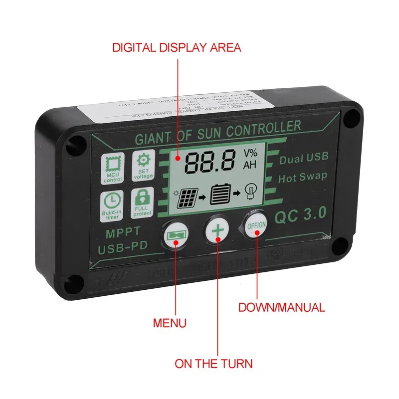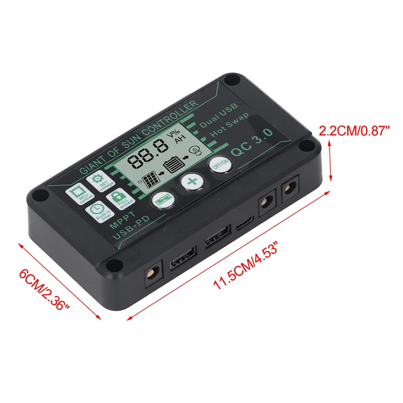 Il vous permet de surveiller les performances de votre équipement solaire sans effort et de prendre des décisions éclairées. * Matériau : plastique + composants électroniques. * Compact et robuste : avec des dimensions de 11,5 x 6 x 2,2 cm, ce contrôleur de charge solaire est compact et facile à installer pour les espaces limités. Il peut gérer diverses options de courant de 10 A à 100 A, offrant flexibilité et évolutivité pour différents besoins énergétiques. Contenu de l'emballage : 1 régulateur de panneau solaire. * Dimensions : environ 11,5 x 6 x 2,2 cm., Couleur : noir. MPPT 100A 12V 24V Fabricant De Contrôleur De Charge Solaire ROHS MPPT | HéliosNE Contrôleur Charge Solaire MPPT Victron Mppt 100/20 Manual Contrôleur Solaire Victron Energy MPPT 75V 10A - Charge Intelligente Pour Batteries 12V/24V Controleur Charge Solaire Caractéristiques : * Nom de la pièce : régulateur de panneau solaire. *Large compatibilité : ce régulateur de panneau solaire est compatible avec 12 V et 24 V, ce qui le rend adapté à une large gamme de configurations de panneaux solaires. Affichage numérique : l'écran numérique intégré fournit des informations en temps réel sur l'état de charge, la tension de la batterie et le courant de sortie. Il est capable de gérer des courants de 10A à 100A (vérifiez le modèle exact), pour des systèmes en 12V ou 24V. La technologie MPPT tire le maximum de puissance... Il aide à maximiser l'utilisation de l'énergie solaire et protège votre équipement contre les surcharges, les décharges excessives et les courts-circuits. Compact et robuste : avec ses dimensions compactes de 5 x 6 x 2,2 cm, ce contrôleur de charge solaire est parfait pour les installations dans des espaces limités. Il optimise le processus de charge et convertit l'excès d'énergie en énergie utile pour les batteries. 70A - Contrôleur de Charge MPPT pour panneaux solaires,régulateur de... Large compatibilité : compatible avec les systèmes 12 V et 24 V, ce régulateur de panneau solaire est adapté à une large gamme de configurations de panneaux solaires. Il est également conçu pour être imperméable, durable et longévité, même dans les environnements extérieurs difficiles. Efficace et fiable : la technologie et les composants de haute qualité utilisés dans ce contrôleur de charge solaire garantissent une charge efficace et fiable pour vos batteries.