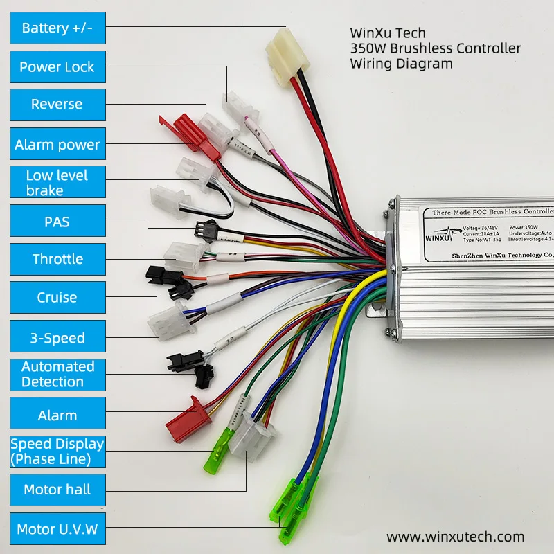 La conception du rétroéclairage vous permet de voir clairement l'écran dans un environnement sombre et ces boutons sont rapides et faciles à utiliser. Moteur Electrique Pièce Vélo électrique Vélo électrique 36V/48V 350W - Écran LCD étanche - Kit Scooter électrique Contrôleur Scooter 48V Contrôleur Moteur Brushless Les boutons permettent une utilisation rapide et facile. Ce contrôleur de moteur électrique convient aux accessoires exquis de vélos électriques, scooters, motos, etc. Le rétroéclairage garantit une visibilité parfaite même dans les environnements sombres. [VITESSE CONSTANTE ET CONTRÔLE PRÉCIS] Ce contrôleur de vitesse sans balais fonctionne silencieusement et est sensible aux conditions du vélo électrique. Contrôleur 350W Sans Balais Contrôleur Moteur Vélo Électrique Sans Balais 24V/36V 350W - Écran LCD Étanche - Kit Conversion Kit Contrôleur Moteur Sans Balais 24V/36V 350W écran LCD Bonne dissipation thermique La coque du contrôleur est en alliage d'aluminium de haute qualité, qui peut protéger le circuit interne, a une bonne dissipation thermique et évite les surcharges thermiques. La conception étanche vous permet de l'utiliser à l'extérieur sans vous soucier de l'entrée d'eau. Option : 1 # 24V-36V ; 2 # 36V-48V , Puissance : 250 W / 350 W [AFFICHAGE ACL] L'écran ACL offre une indication claire de l'état et des données du moteur. [FACILE À INSTALLER ET À UTILISER] Fourni avec un support pour écran LCD, ce contrôleur s'adapte facilement au guidon de 22,5 mm. Contrôleur sans balais] : le contrôleur de vitesse du moteur est de type brushless, fonctionne silencieusement et sensible à l'état du vélo électrique, il peut fournir une vitesse constante et un contrôle sensible du freinage et des changements de direction Cuque Kit de contrôleur de moteur sans balai pour vélo Kit de... Rouge : électrode positive de puissance Noir : électrode négative de puissance Jaune : puissance de sortie Marron : électrode positive de la lampe Blanc : électrode négative de la lampe Bleu : signal indicateur Vert : réception du signal Veuillez noter que le modèle de contrôleur sera envoyé au hasard et assurez-vous que cela ne vous dérange pas avant de commander. Protégez toujours la sécurité des vélos électriques et apportez une expérience confortable. Spécifique: Matériau : plastique + LCD + méta Couleur: Montré comme image Taille du contrôleur : env. Note: Chaque câble est étiqueté avec une couleur pour différentes utilisations.