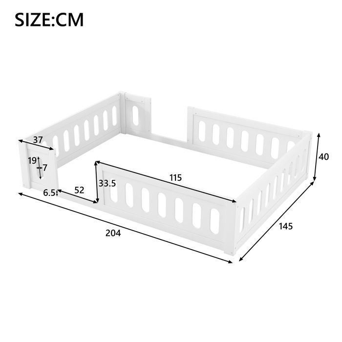 Le sommier à lattes assure un support confortable pour un sommeil reposant, tandis que le design élégant évite de dénaturer l’esthétique de la chambre d’enfant. Sécurité Maximisée pour la Croissance: Les coins arrondis et la protection contre les chutes de ce lit pour enfants réduisent le risque de blessures. Système anti-chute amovible, s’adaptant aux différentes phases de croissance de l’enfant (de 3 à 8 ans). La barrière décorée de motifs étoiles et lune stimule l'imagination et l'intérêt des enfants, alliant parfaitement fonctionnalité et plaisir., 3., Tranquillité Parentale & Confort Enfant Tous les détails (angles arrondis, peinture non toxique, barrière anti-chute) sont conçus pour minimiser les risques. ML-Design Lit au Sol Double 140x200 cm Blanc, avec Sommier à Barrière décorée de motifs étoiles-lune stimule l’imagination et suscite l’intérêt des petits. Bois massif résistant à l’usure enfantile, il accompagne la croissance de l’enfant sans besoin de remplacement fréquent., 2., Promotion de l’Indépendance Sa hauteur basse permet à l’enfant de monter et descendre seul, développant son autonomy selon la méthode Montessori. Lit cabane enfant 140x200 cm avec barrière de sécurité, sommier à... Disponible en 3 tailles : 90x200 cm, 120x200 cm et 140x200 cm, répondant à différents besoins d’espace. Charge maximale : 100 kg Matériau de la structure : pin + MDF Matériau des lattes : bois Procédure de montage : à installer soi-même., Nombre de colis : 1 1., Investissement pour la Longue Durée Contrairement aux lits bébés à usage temporaire, ce lit au sol s’adapte aux âges de 3 à 8 ans grâce à sa barrière amovible et sa haute capacité de charge. Flexibilité d’Adaptation aux Âges: Barrière de sécurité installable à gauche ou à droite selon les besoins. Hauteur Basse Style Montessori ML-Design Lit Au Sol Double 140x200 Cm Blanc, Avec Sommier à Lattes Et Protection Contre Les Chutes Lit Dadolescent En Pin Massif Cadre De Lit Pour Garcons Et Filles Lit En Boi 91752179 Lit Cabane Enfant Fabriqué en pin massif, contreplaqué et MDF de qualité, ce cadre de lit est solide et durable - il pourra accompagner votre enfant pendant des années. Le design... Assemblage Simple et Tailles Variées: Design intemporel s’intégrant à toute décoration intérieure.
